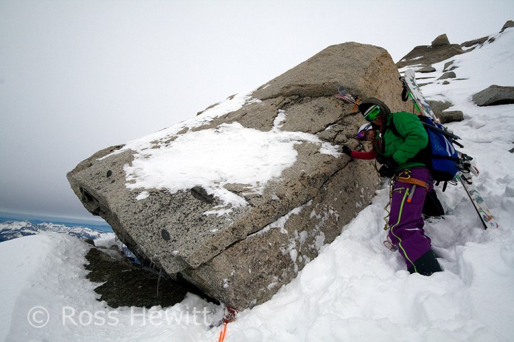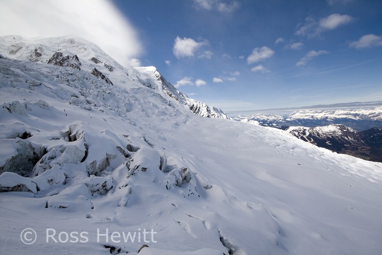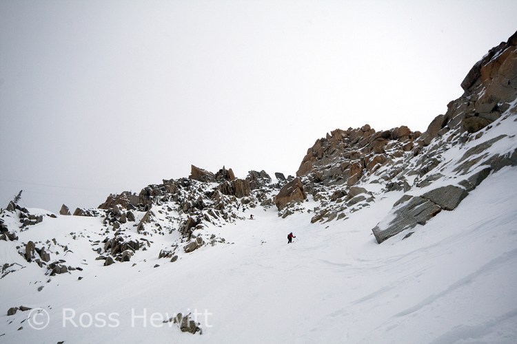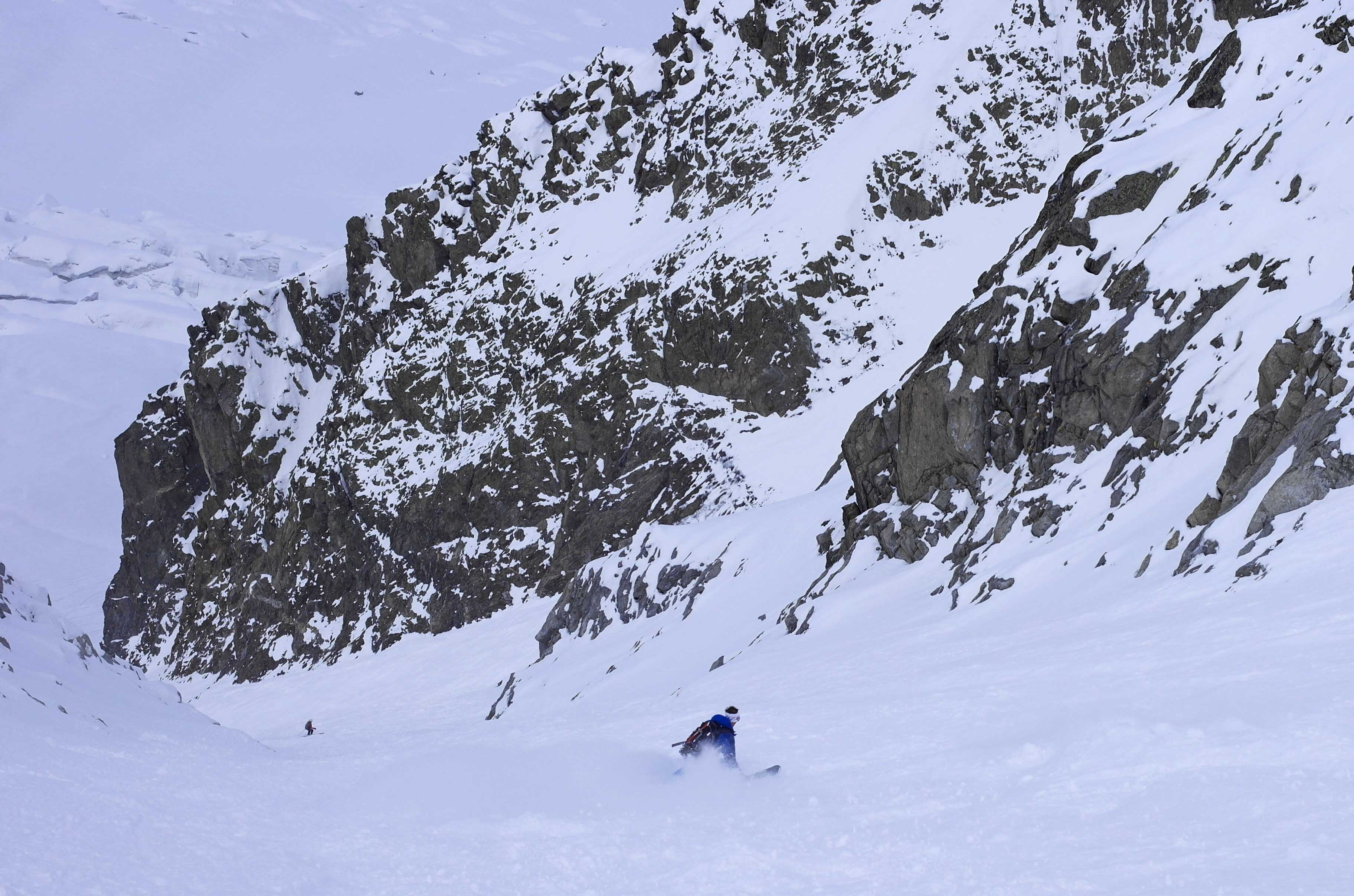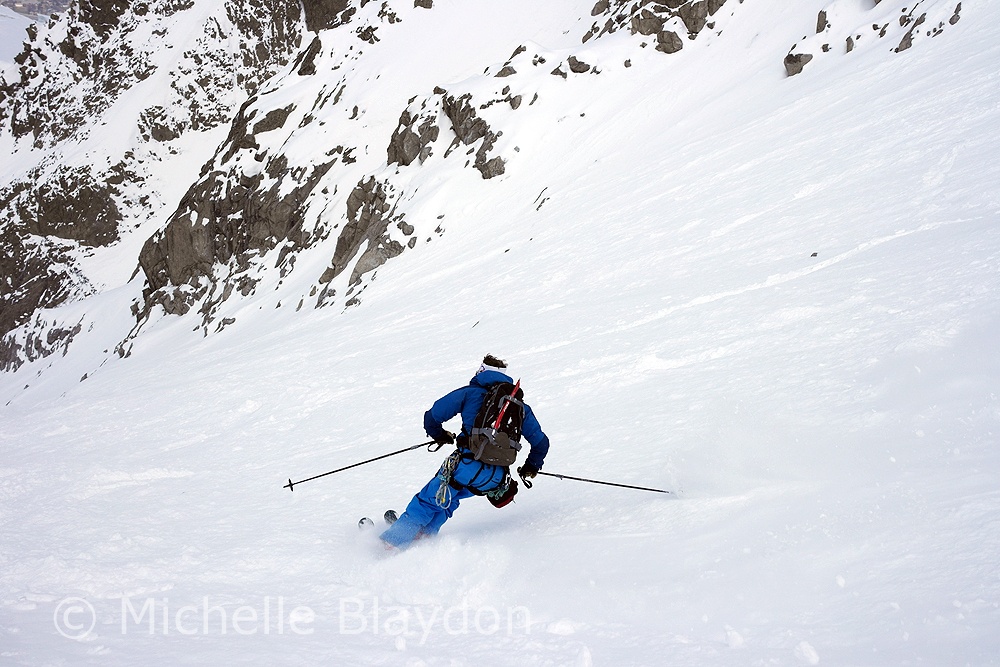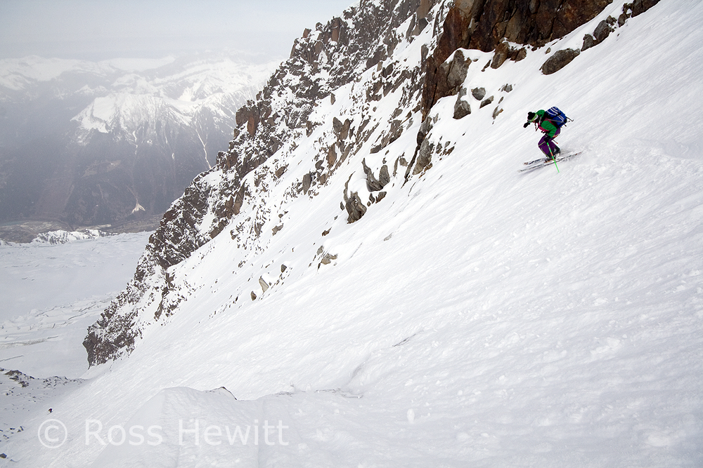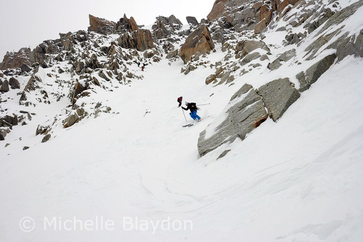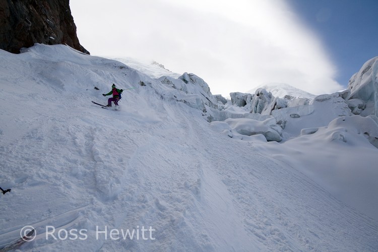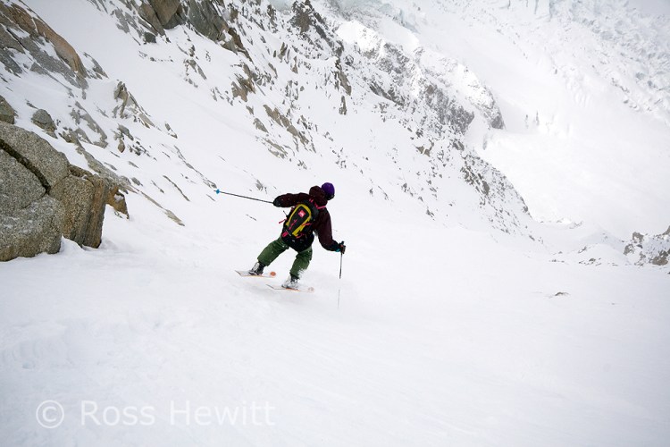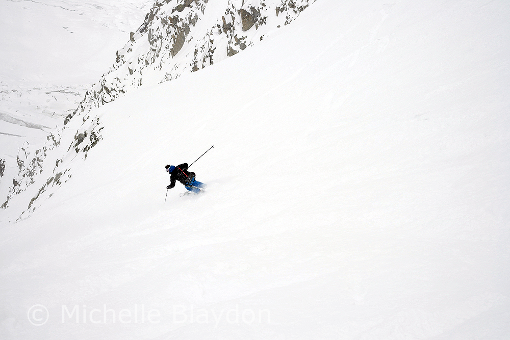 We went to the Cosmiques because we heard it was awesome, once you got past the top bit that is, which had a bluish tone to it. We abbed that bit, as the girls (one is known as Ginger Wookie) who were Comsique virgins didnt need to sample the worst it had to offer. As I stand on my skis waiting for the girls to get their skis on and pull their ropes, someone screams rock and I see a microwave sized block slam into a guy abseiling and accelerates onwards. I decide to slide forward and take my chances on bluish snow ice as the boulder speeds towards the team below. Memories of having my nose broken here a lifetime ago by careless people abseiling above teams. The injured skier had to get roped out of the couloir. Surprising his leg didnt shatter.