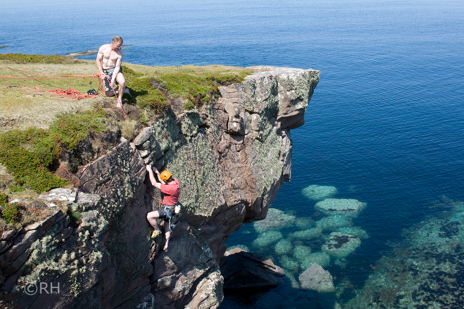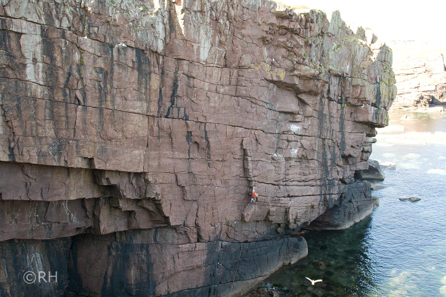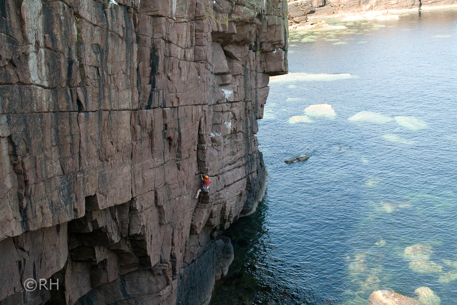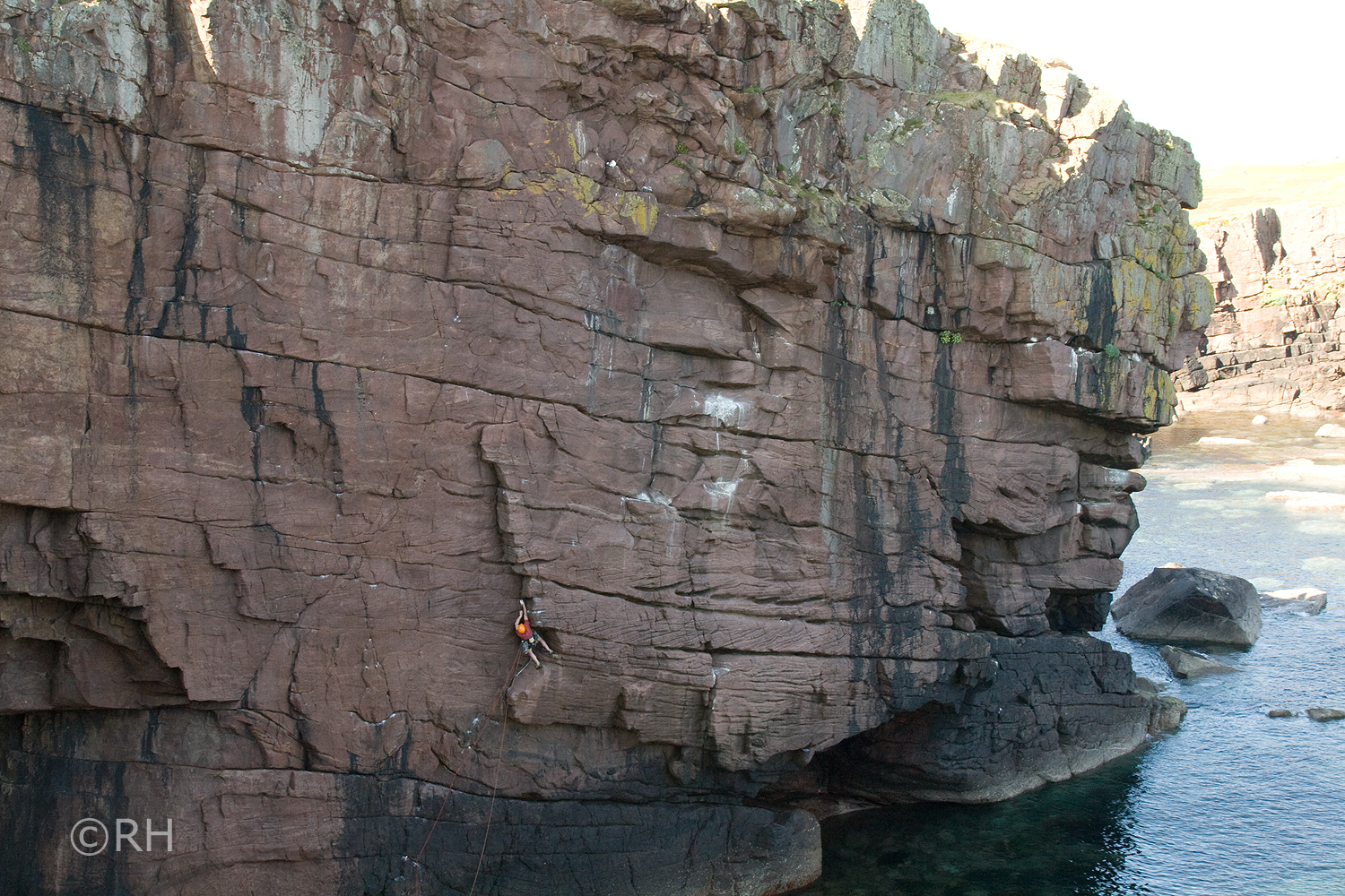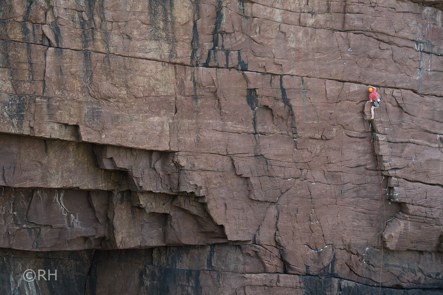 The heat wave was set to continue so we headed to the far NW of Scotland and the cooler north facing crags to sample some of the 1000 million year old Torridonian sandstone. Headlong E4 and Culach E5 were the highlights with some thought provoking top outs with Roaring Forties in Amphitheatre Bay quite a mental test on less than perfect rock.