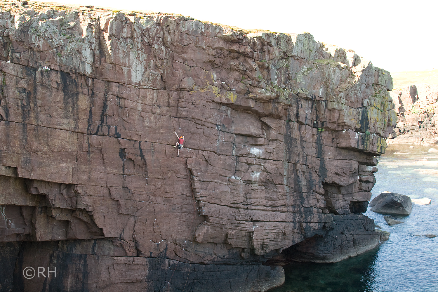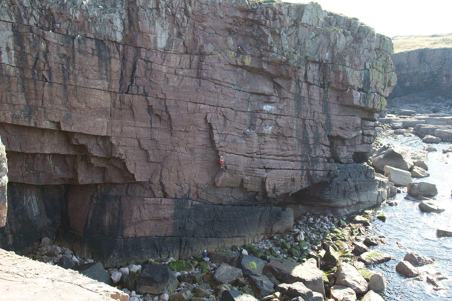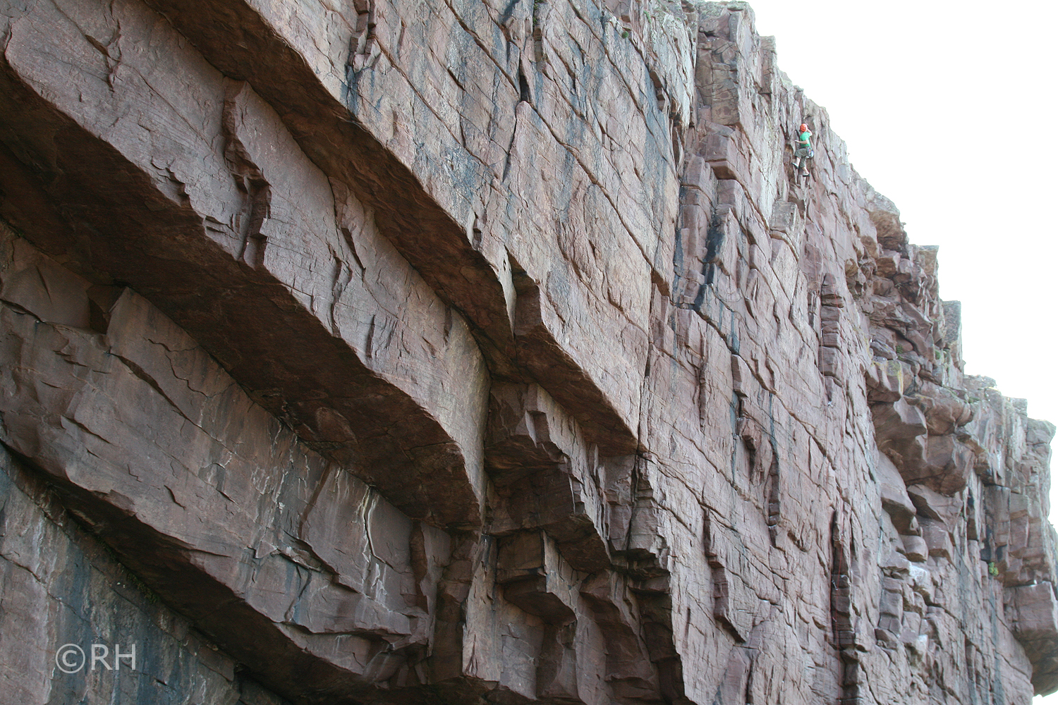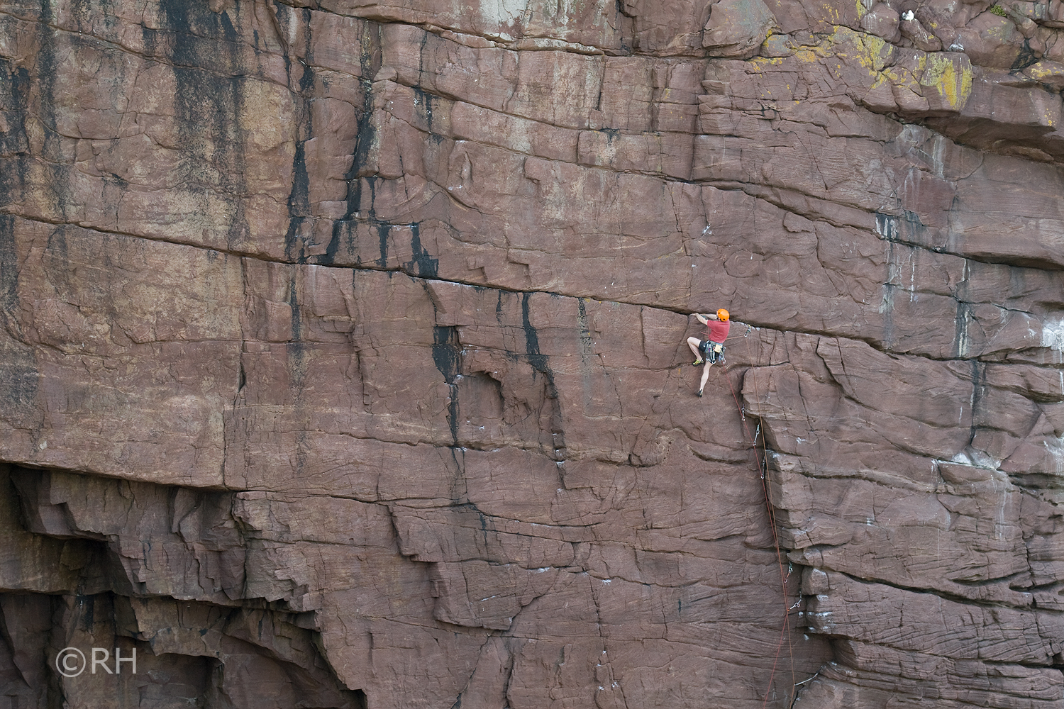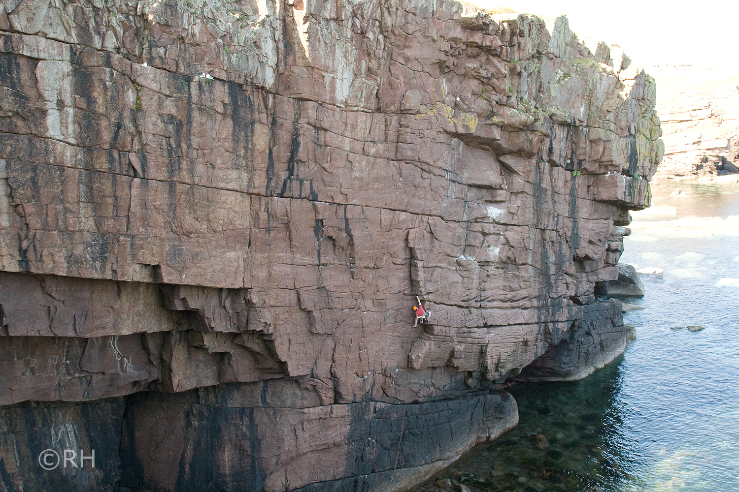 The heat wave was set to continue so we headed to the far NW of Scotland and the cooler north facing crags to sample some of the 1000 million year old Torridonian sandstone. Headlong E4 and Culach E5 were the highlights with some thought provoking top outs with Roaring Forties in Amphitheatre Bay quite a mental test on less than perfect rock.