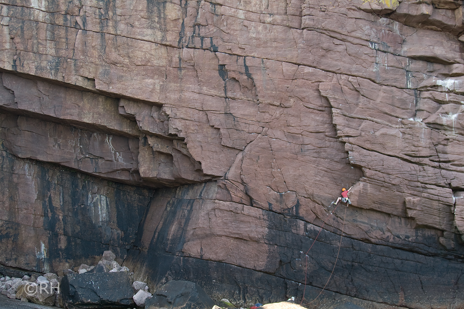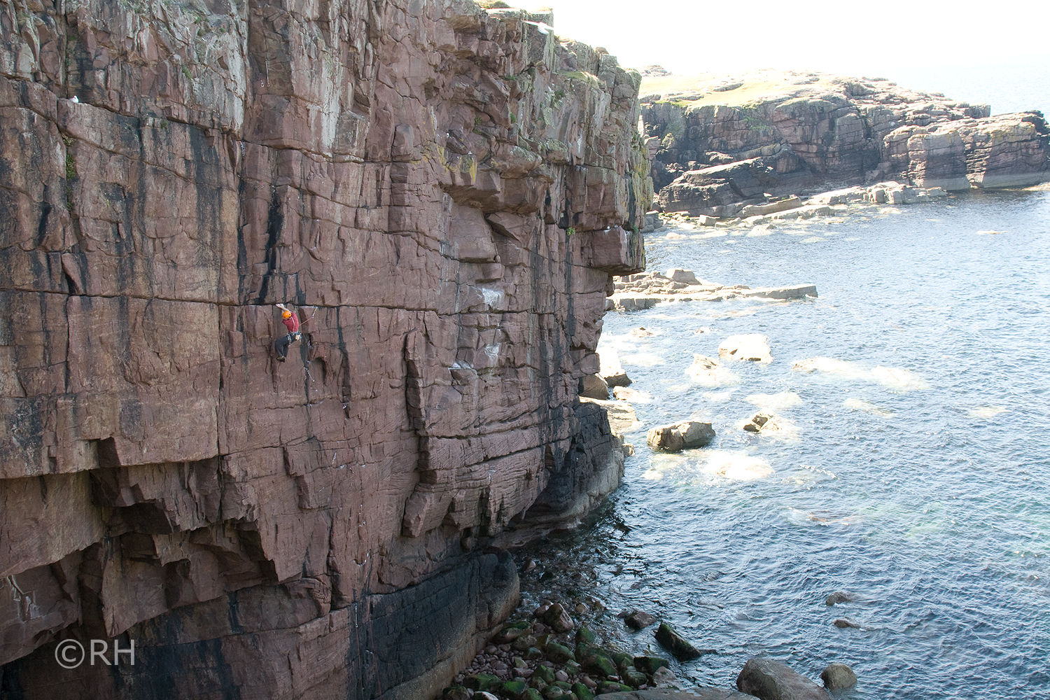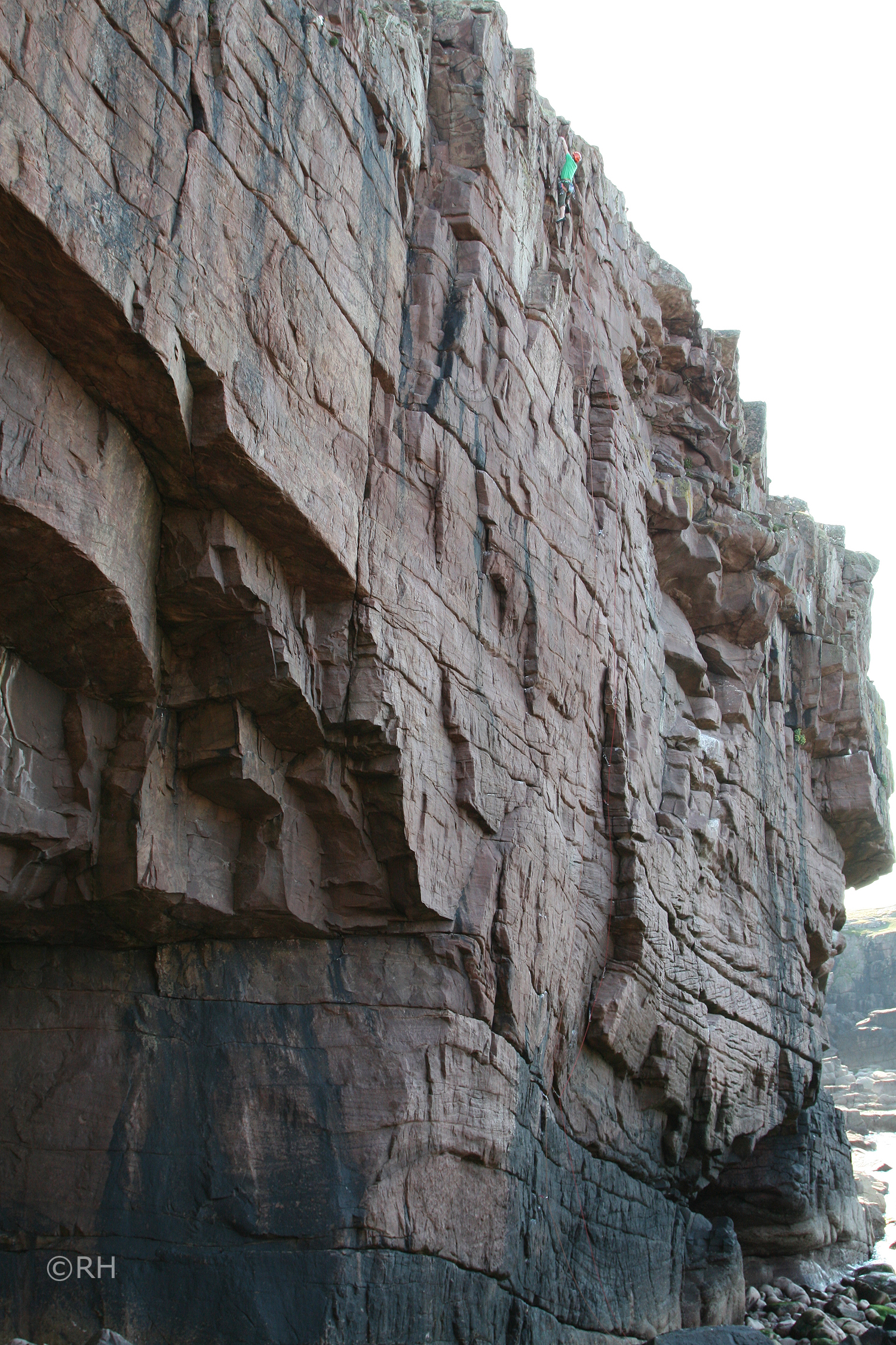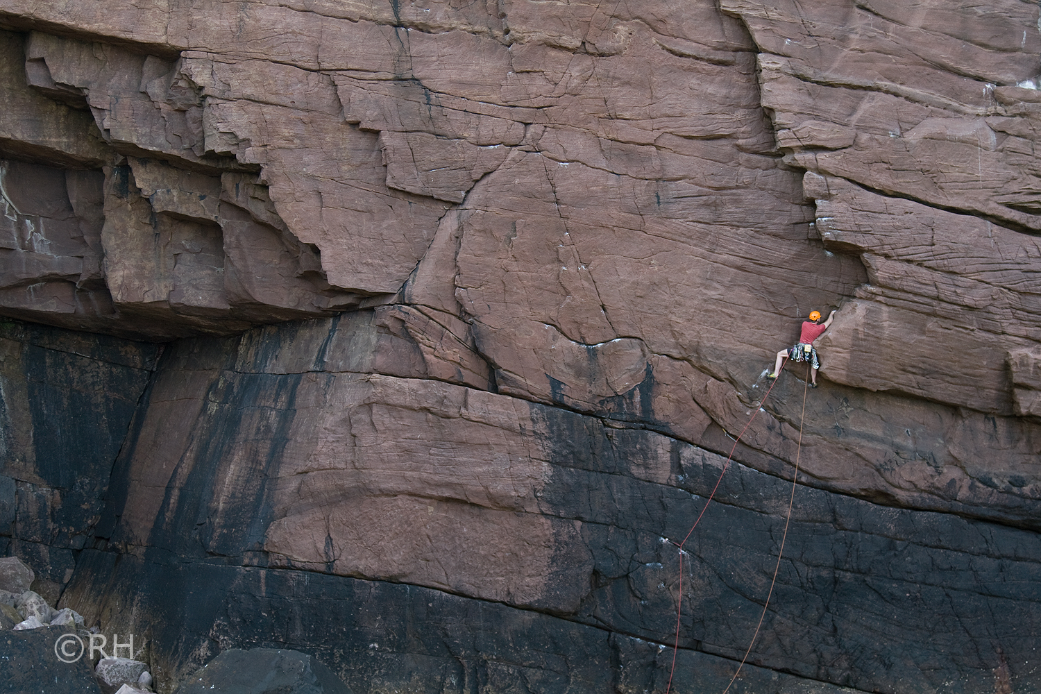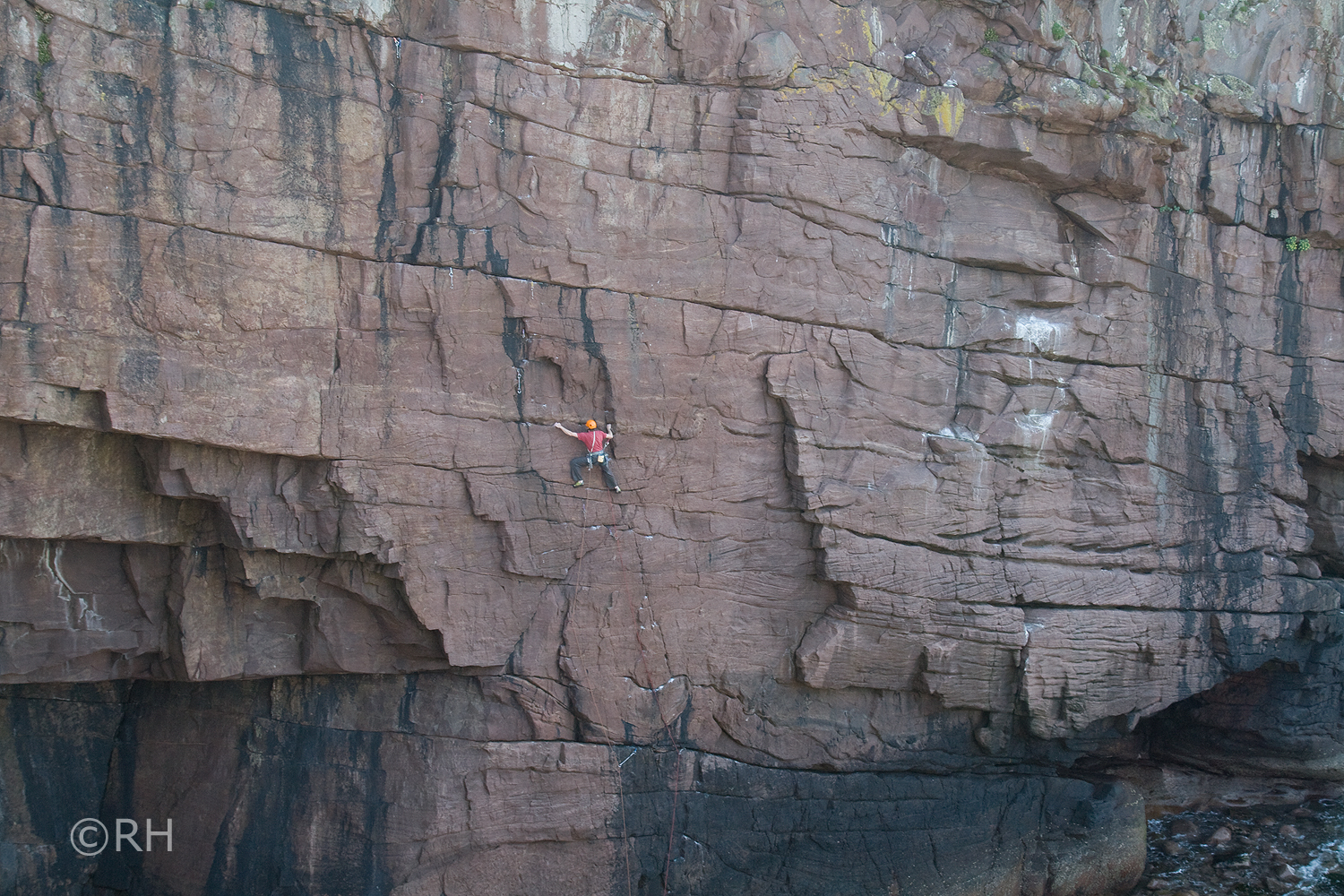 The heat wave was set to continue so we headed to the far NW of Scotland and the cooler north facing crags to sample some of the 1000 million year old Torridonian sandstone. Headlong E4 and Culach E5 were the highlights with some thought provoking top outs with Roaring Forties in Amphitheatre Bay quite a mental test on less than perfect rock.