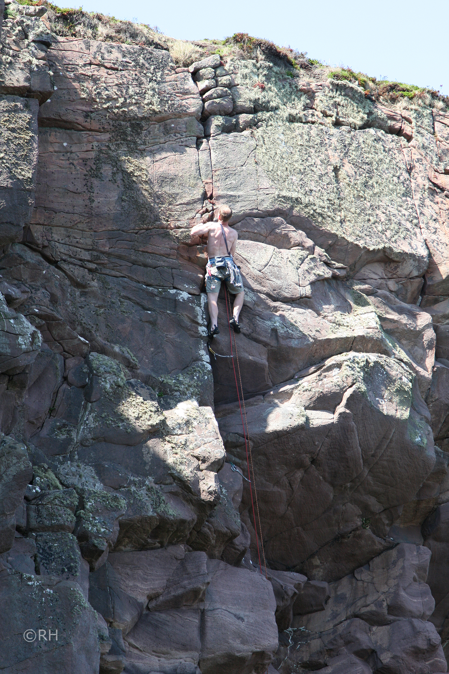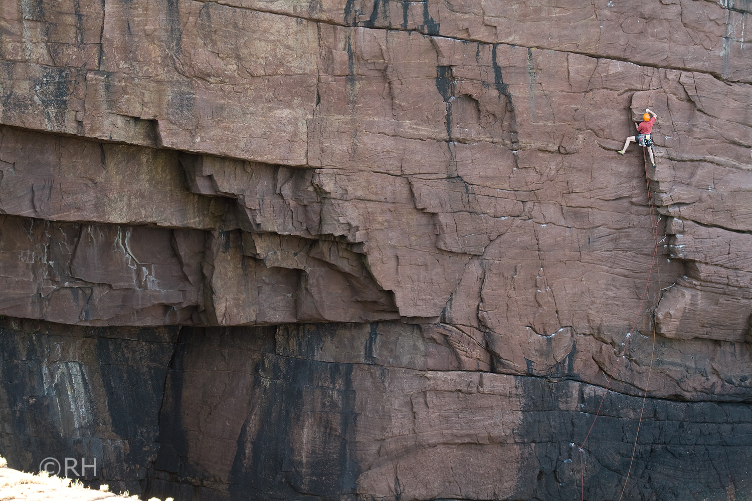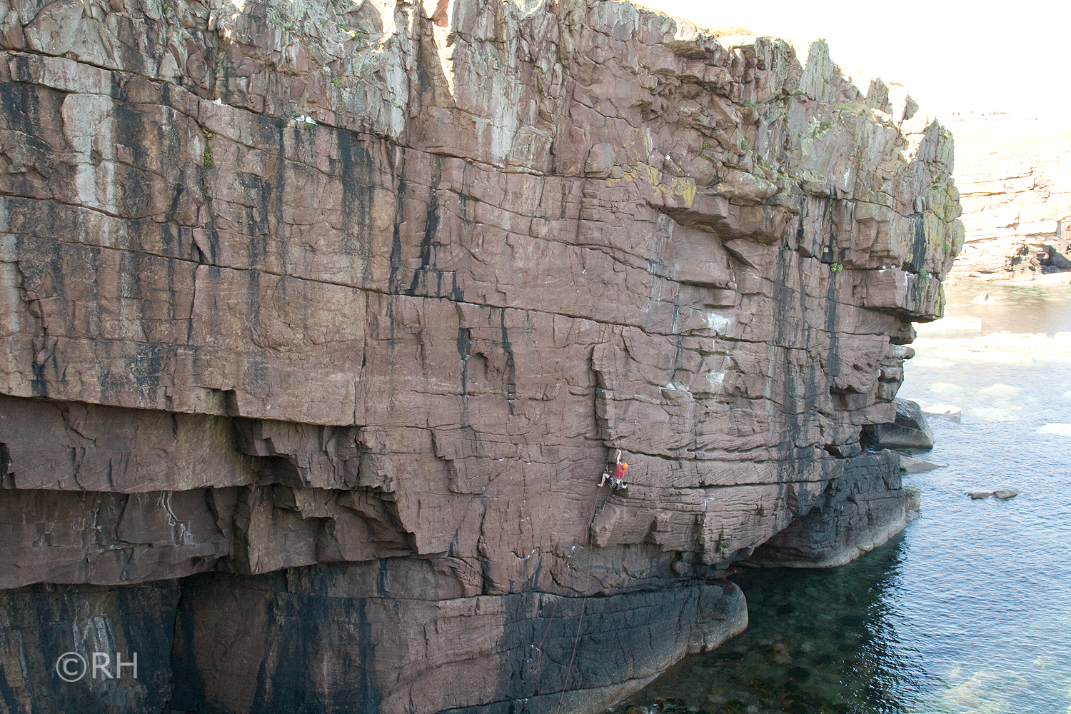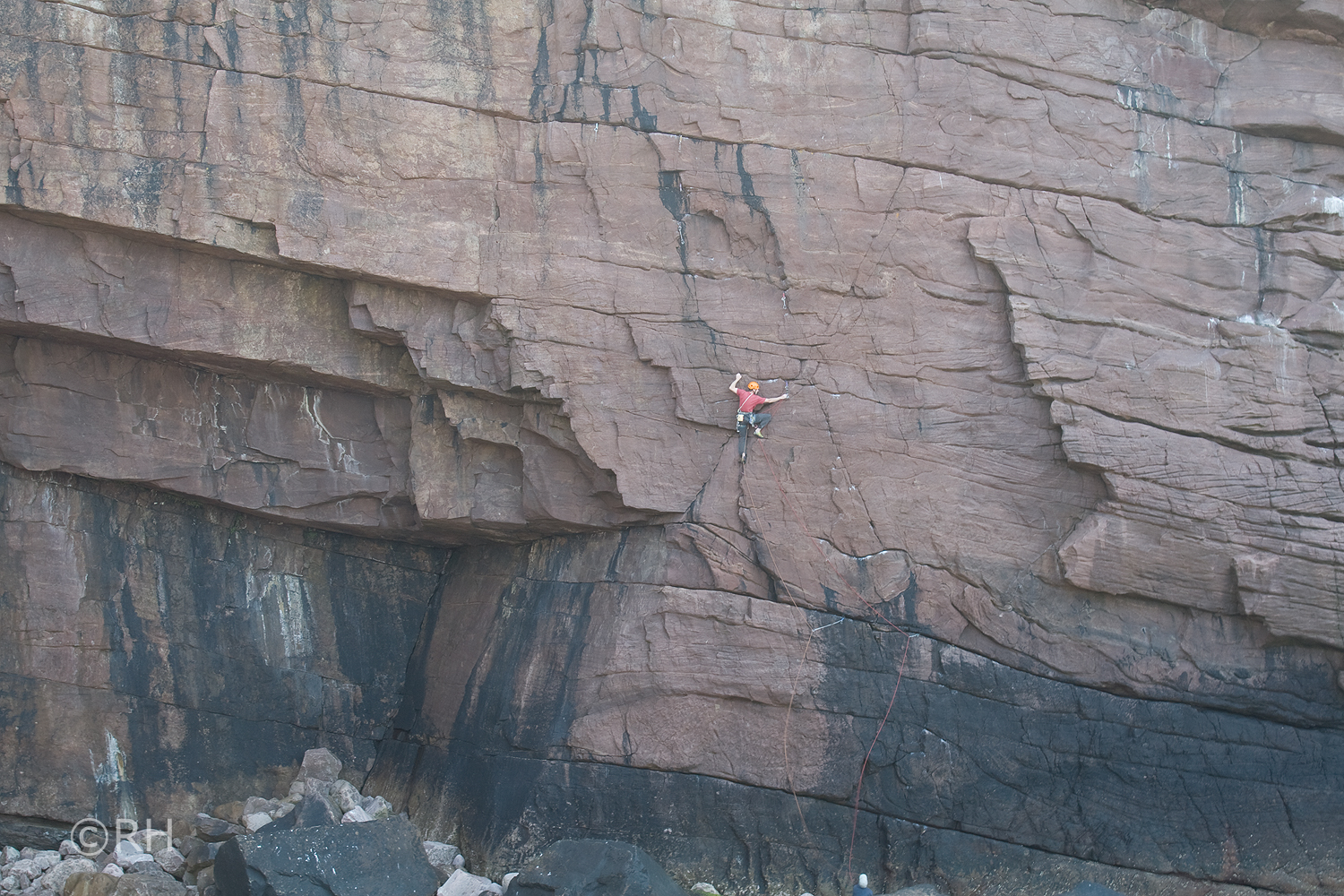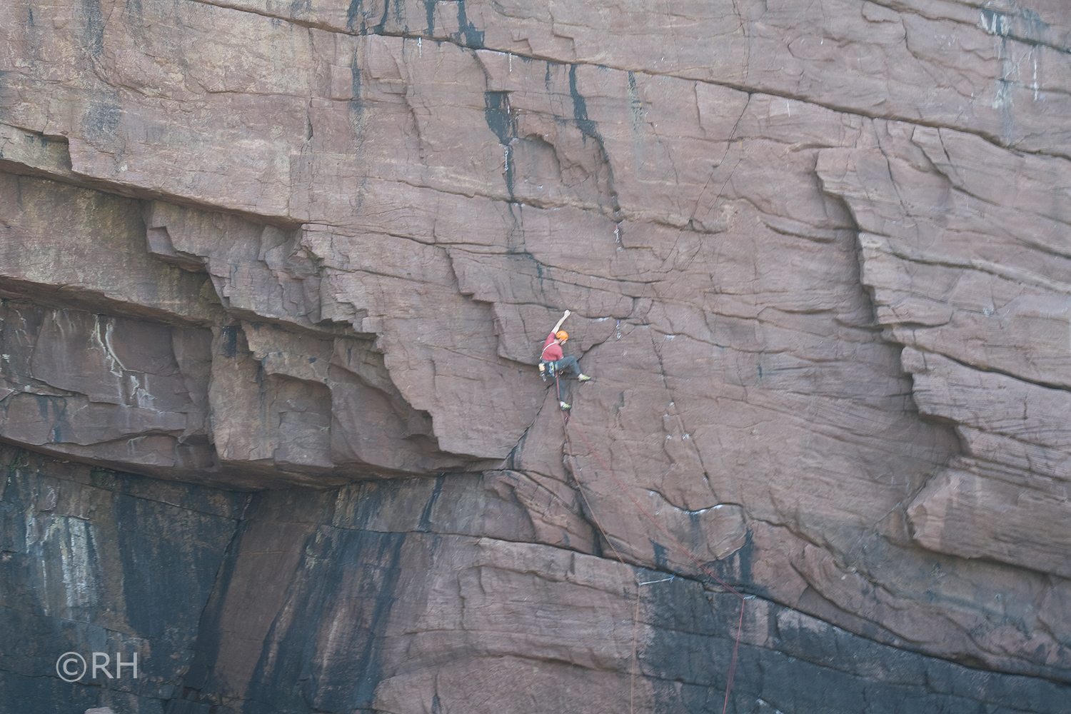 The heat wave was set to continue so we headed to the far NW of Scotland and the cooler north facing crags to sample some of the 1000 million year old Torridonian sandstone. Headlong E4 and Culach E5 were the highlights with some thought provoking top outs with Roaring Forties in Amphitheatre Bay quite a mental test on less than perfect rock.