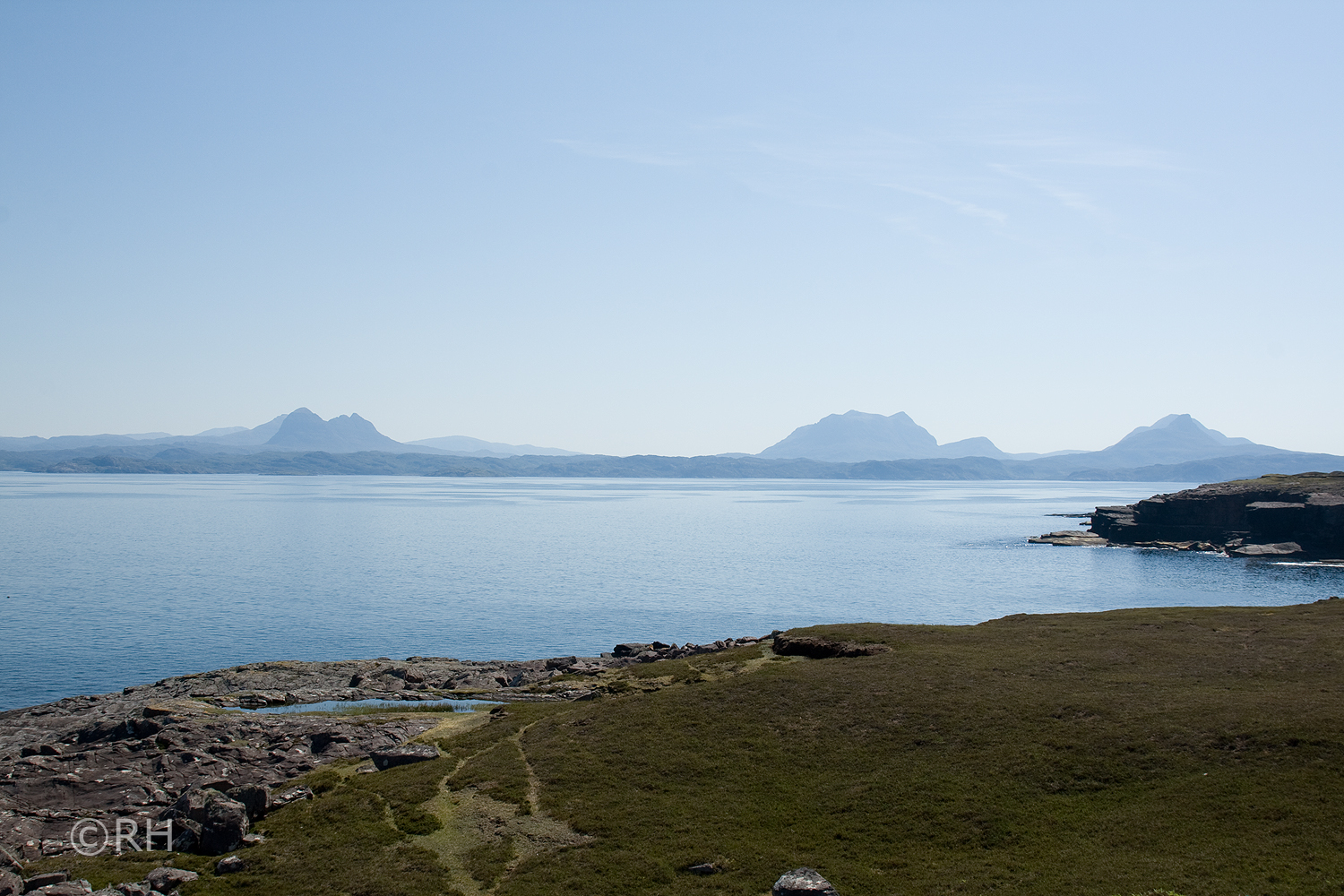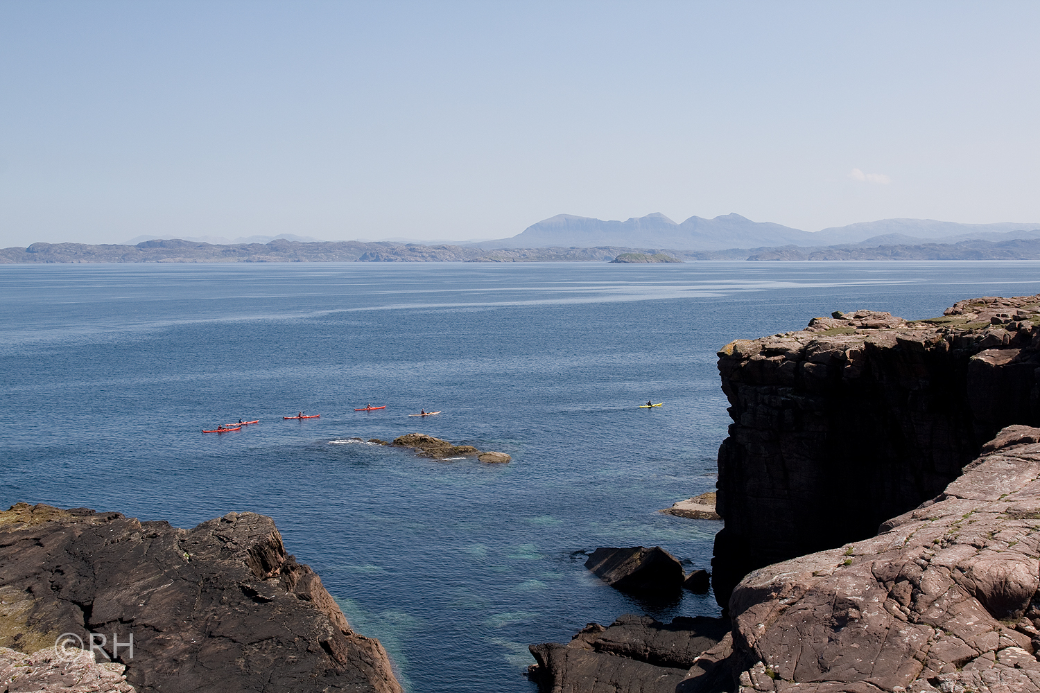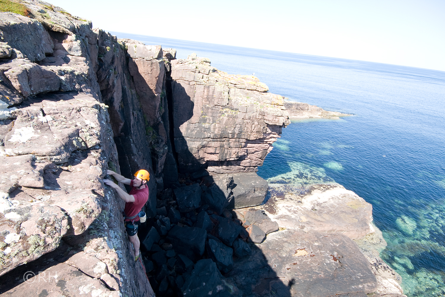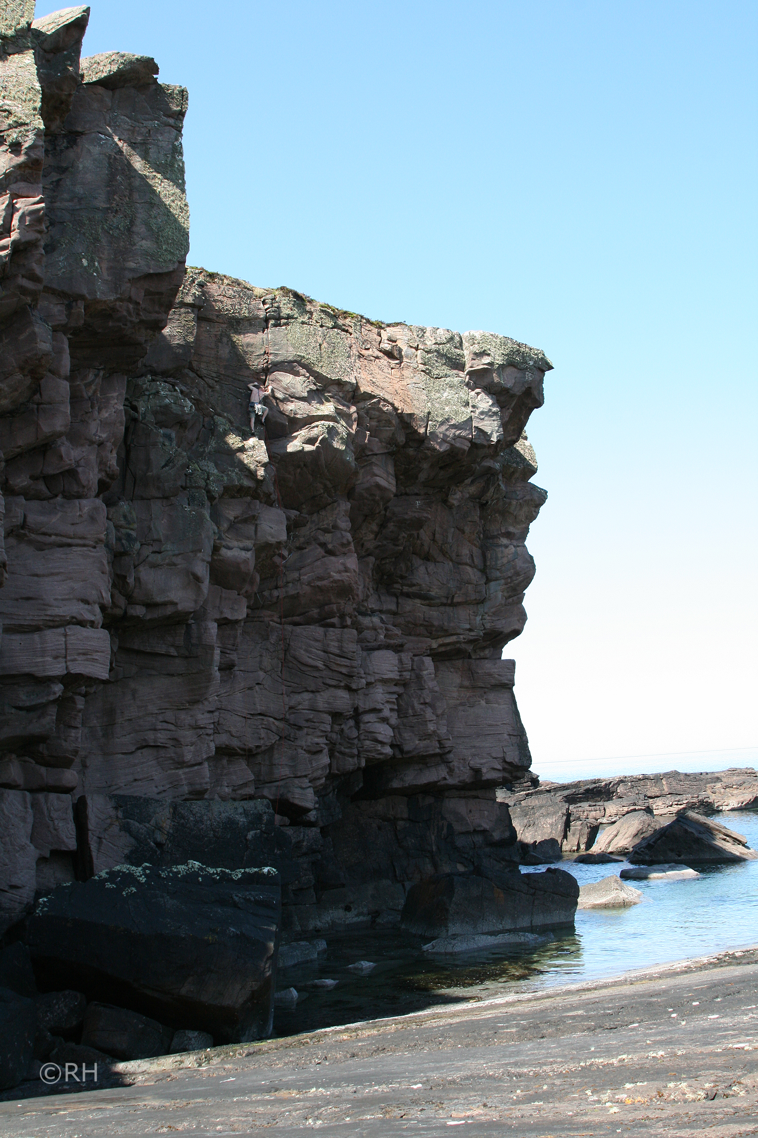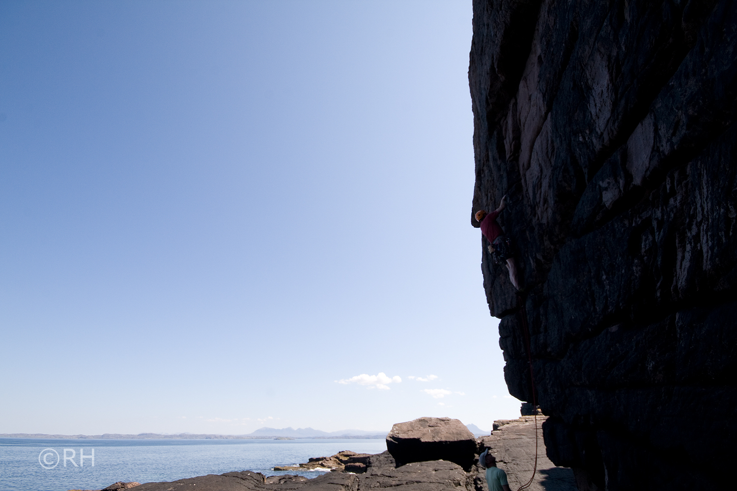 The heat wave was set to continue so we headed to the far NW of Scotland and the cooler north facing crags to sample some of the 1000 million year old Torridonian sandstone. Headlong E4 and Culach E5 were the highlights with some thought provoking top outs with Roaring Forties in Amphitheatre Bay quite a mental test on less than perfect rock.
