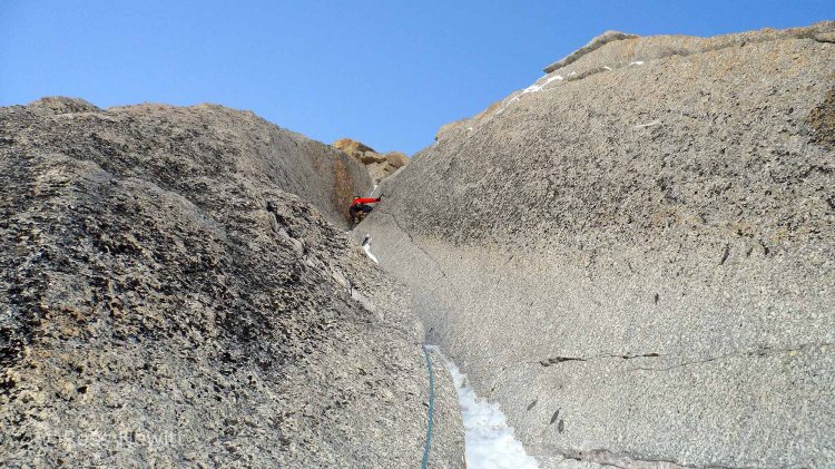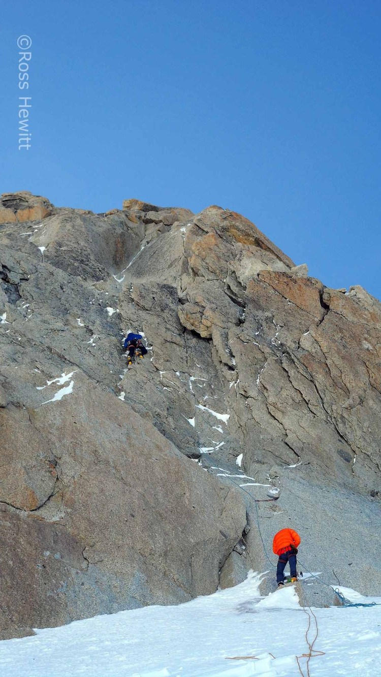 James kicked off on the first pitch a quickly despatched a tasty pitch with grooves and flakes to wet the appetite. Dave then took up the challenge of a large open book corner. A tell tale sign of the battle ahead was the first metre of the walls coming out the corner had no lichen where a fat river of ice normally flows. James and myself got deep into conversation ignoring Youths continuous dialogue about how hard it was. It all seemed fine seconding, that is if you are into laybacking of sloppy axe jams in a 3 inch verglassed offwide with crampons smeared on crystals. I have to concede to Dave that it probably felt right spicey out there on the lead and well done to that man! After the batism I was ready to get on the sharp end and enjoyed getting moving on a more straightforward pitch allowing me to enjoy the climbing without being terrified. I reckon this was my first adrenaline rush in 2 months and felt so good to be back in the playground, sharing the day with friends and soaking up the views. It could have been a bit warmer though with a chilly wind making a nuisance of itself and making my glad I had my 6000s while the boys complained of cold feet. Romping back to the Midi didn’t feel that bad after all!
