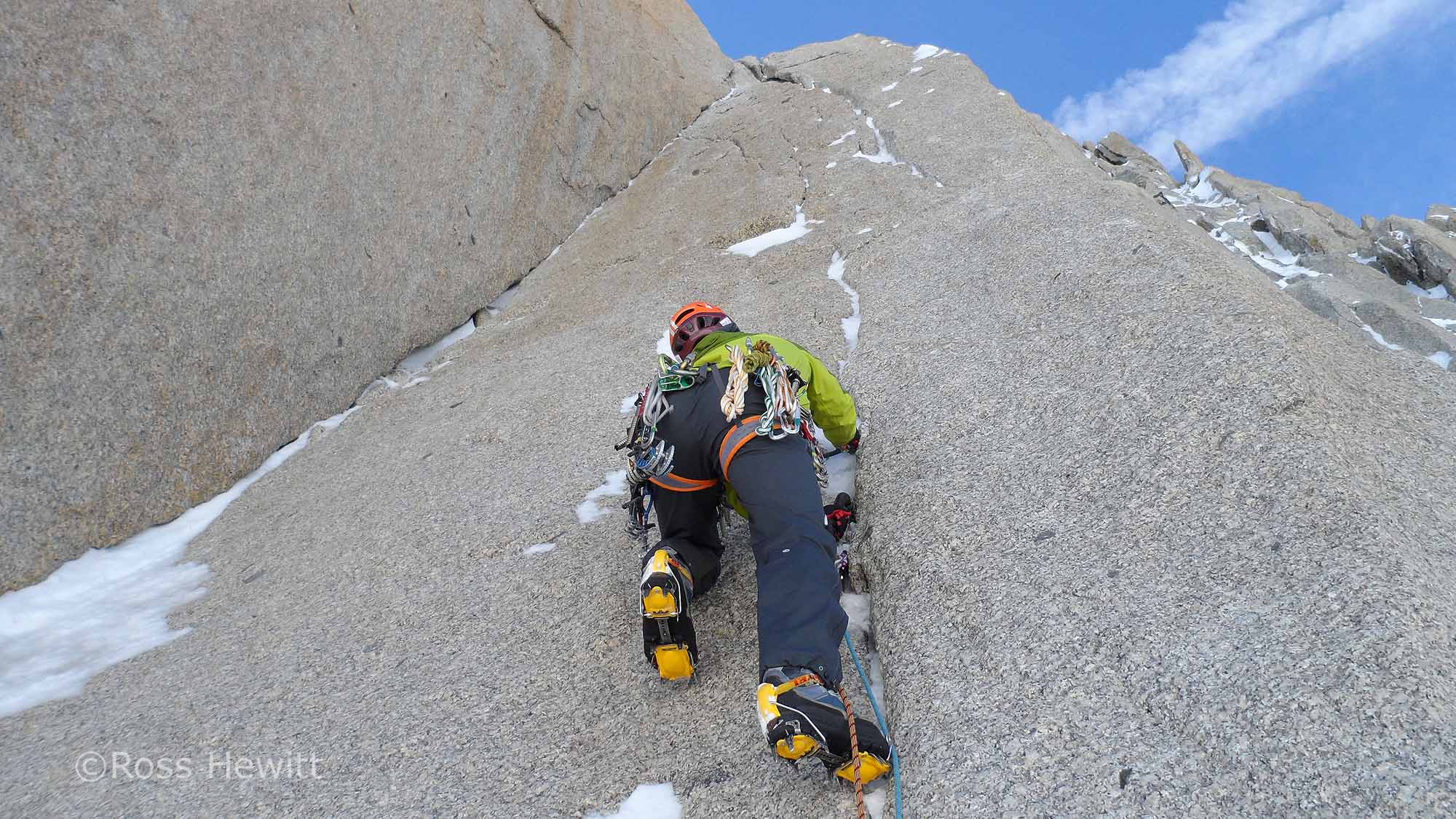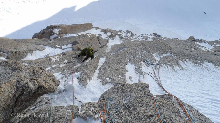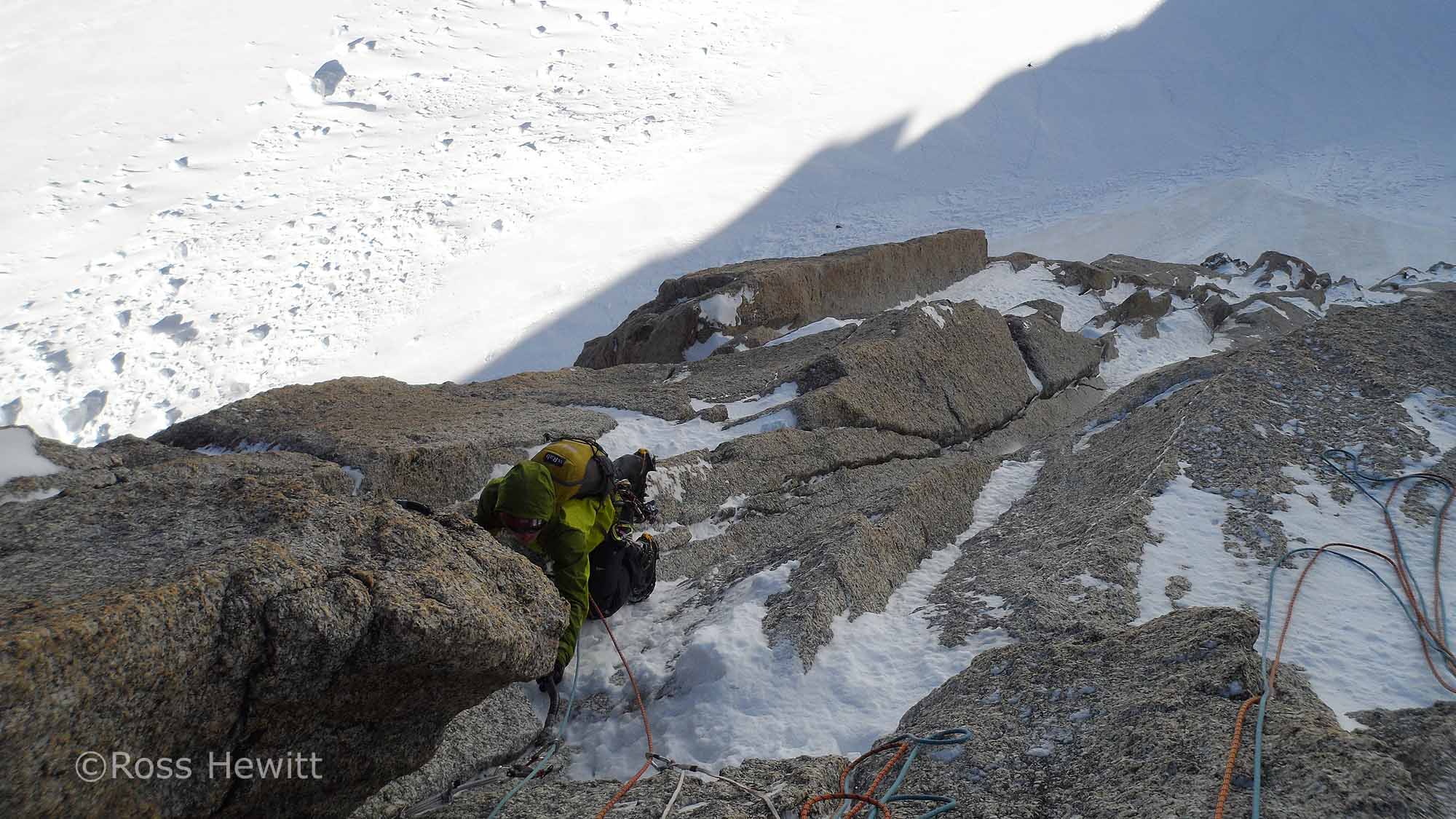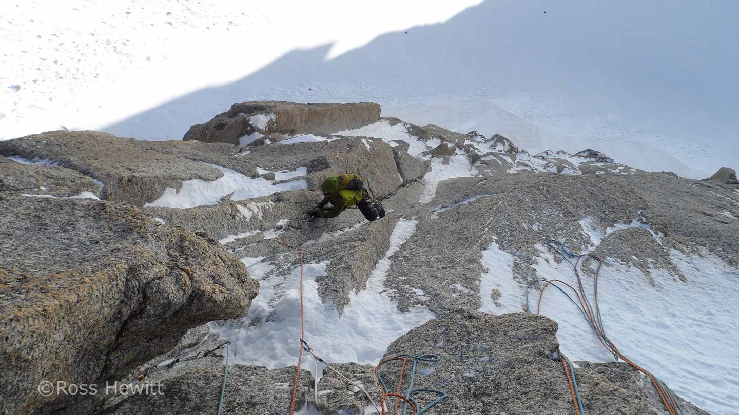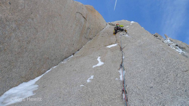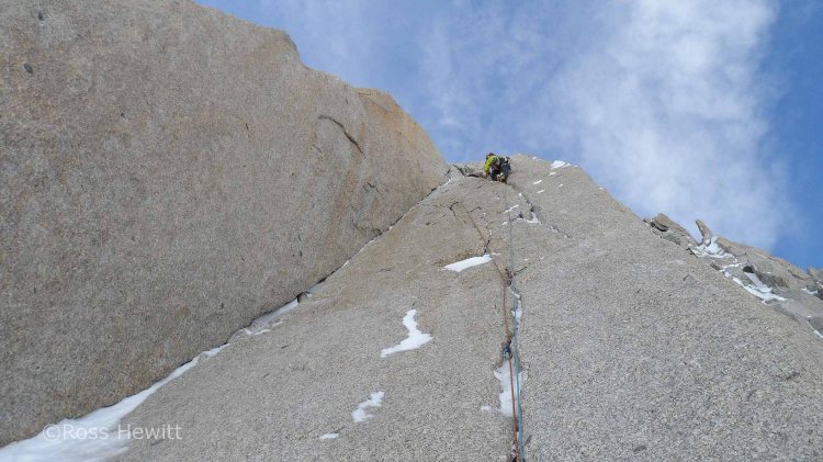 I was keen to climb a superb corner a couple of pitches up which I’d previously seen friends Mike and Jim climbing. Ali kicked off with beautiful cracked slab or golden granite which led towards the corner. Arriving in the corner things were getting thin from previous ascents and some sloppy torques led to better hooks. What appeared to be a bolt and hanger winking at me at the top of the corner under a roof turned out to be an ice screw hammered into a crack – someone must have been gripped!