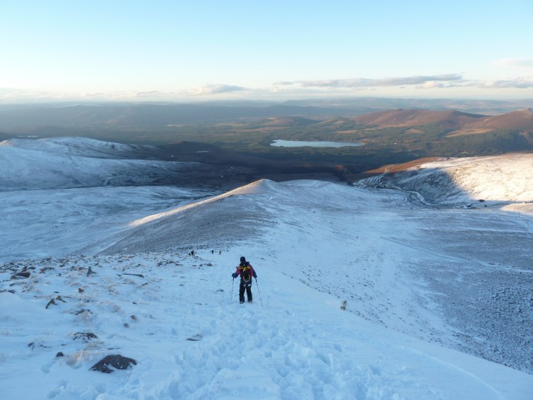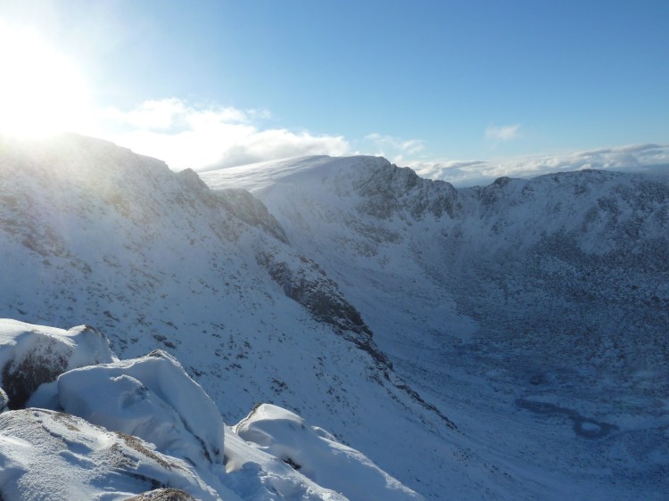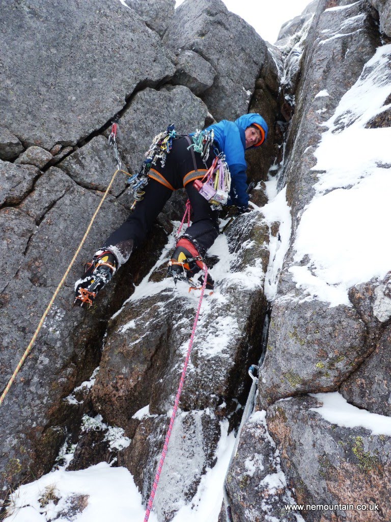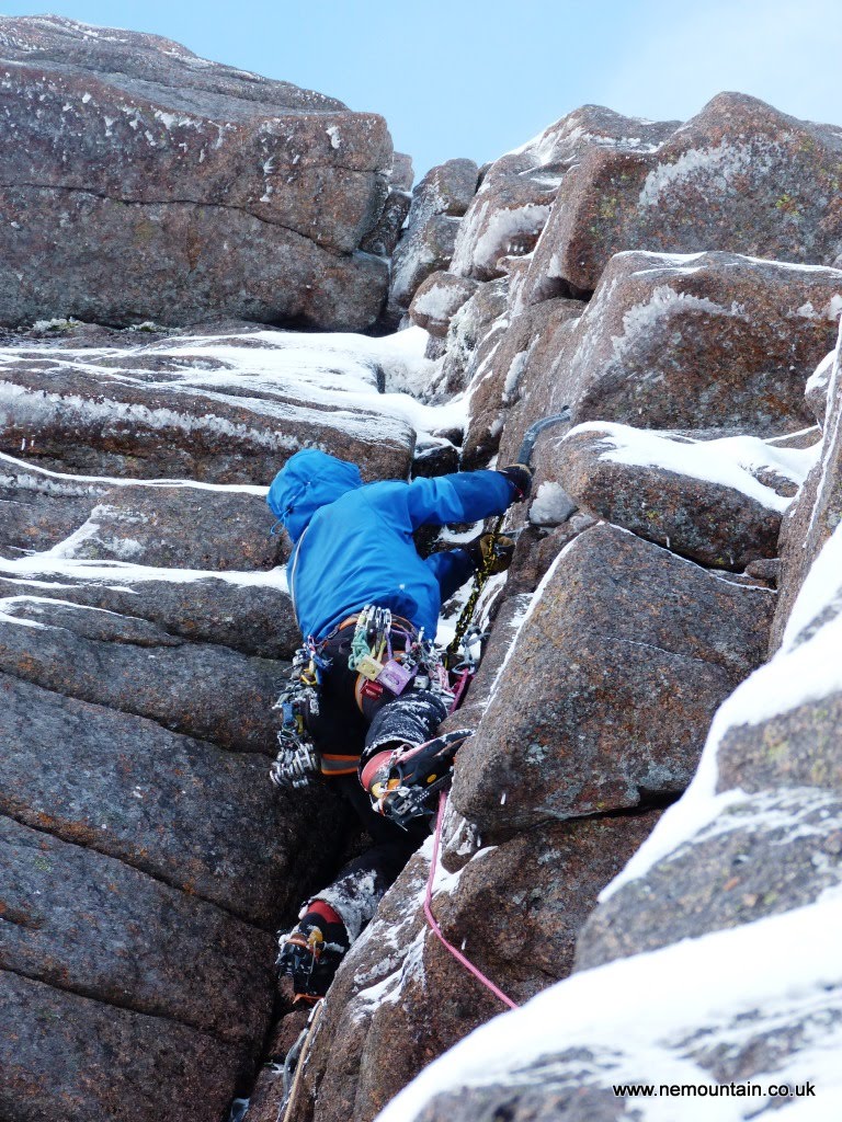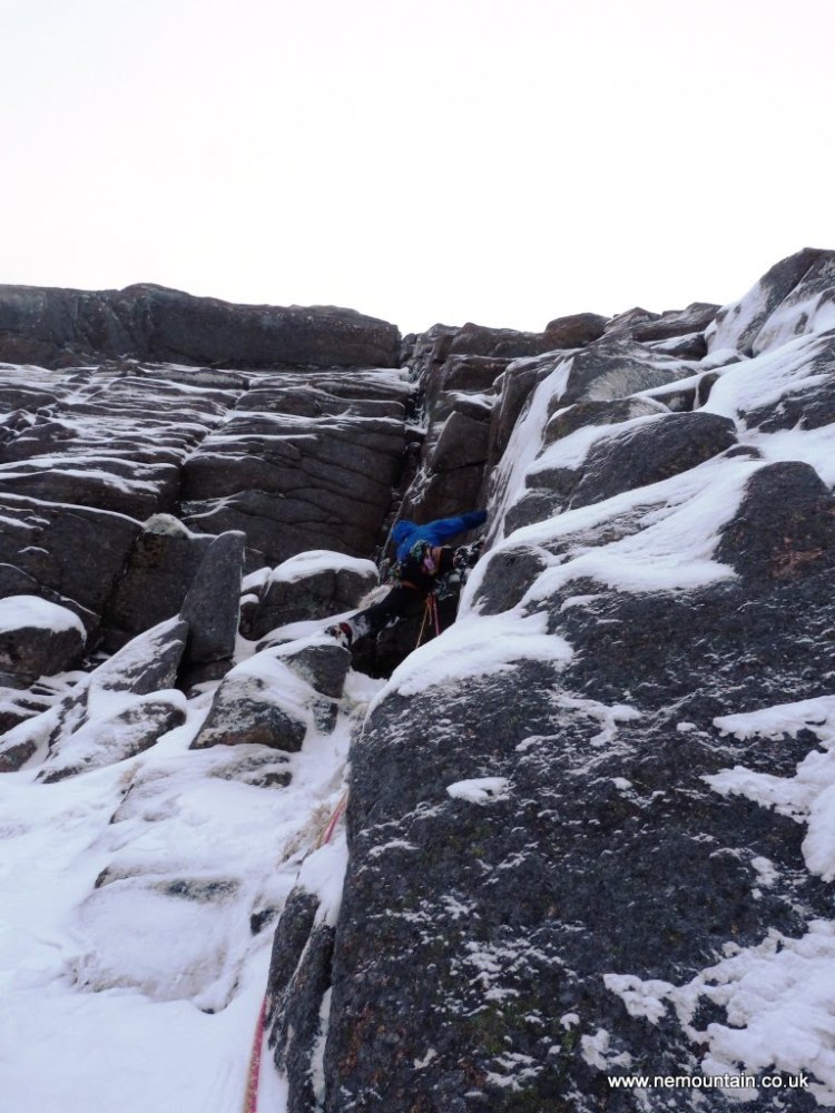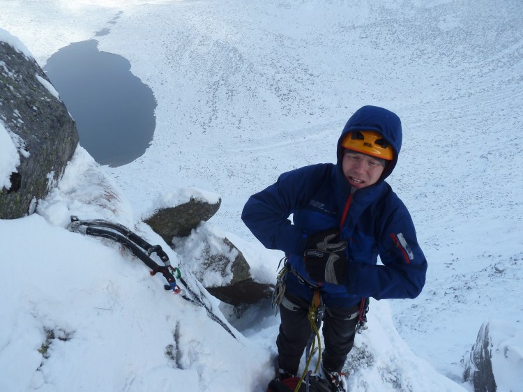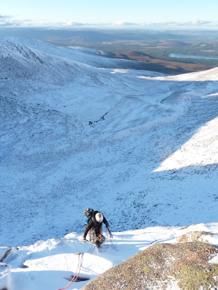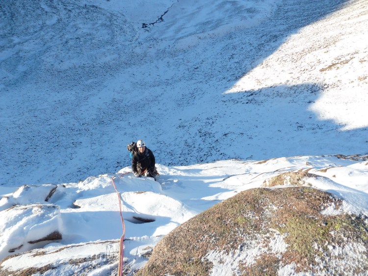 The arrival of snow coinciding with our return from Kalymnos couldn’t have been more perfect and allowed me to get out in the Scottish mountains both days at the weekend.  On Saturday I was in the Northern Corries with Duncan Patterson where conditions where good on Melting Pot, the top pitch of which was really fun and thought provoking. Today I went out with Pete Benson to Lochnagar with a view to doing something a bit more meaty. However we found the turf on Lochnagar pretty soggy biscuit so dropped the grade somewhat and did Ghost Dance which has a fairly rocky main pitch and is a good choice for a short day. The main pitch is fun with cool moves through an overlap onto the wall above.