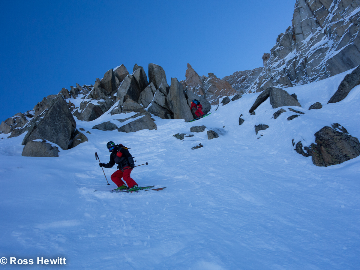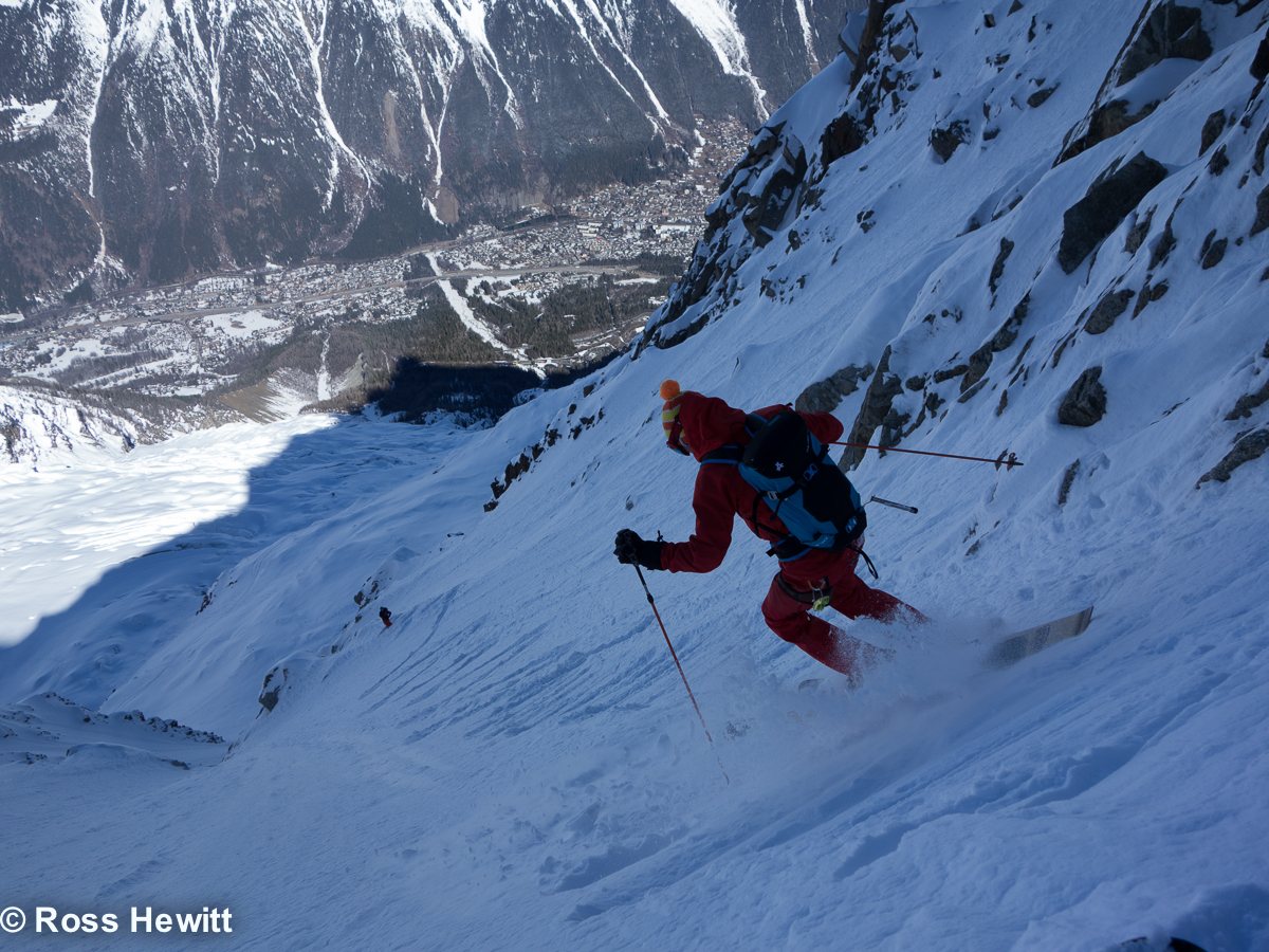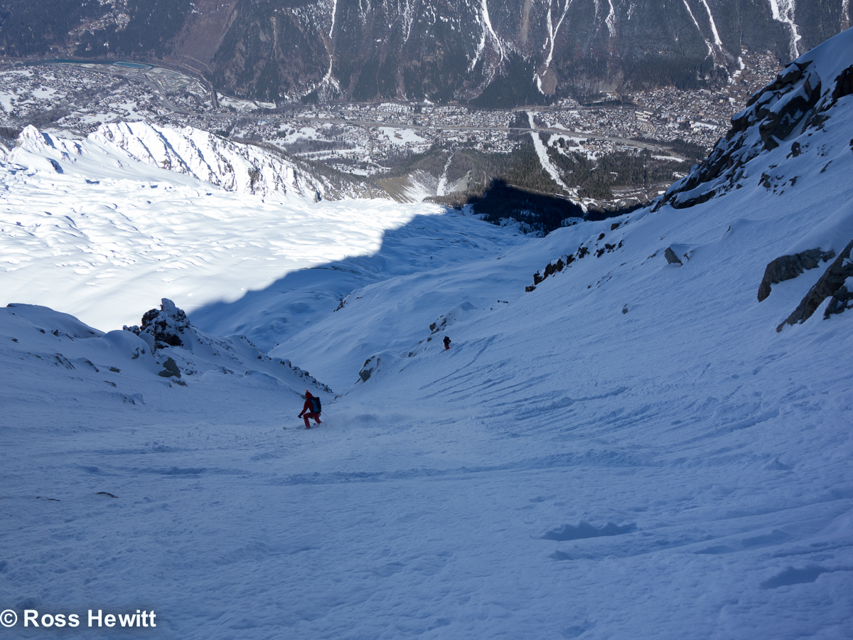 After fighting the queues to get up the lift we were all psyched to get going on a big Midi day and making the most of the fine weather. Drew Tabke has some time off after winning the men’s FWT title and joined Dave Searle and myself. On the way down the arrete I started to feel some discomfort in my back and by time we arrived at the Cosmiques hut my back was seizing up quickly. After a handful of ibuprofen tablets it was time to push on and good skiing took us to the col at the top of the Salopar. By now I was feeling the pain standing still so Dave took over leading and the rope work. The snow was good but with the usual sharks teeth in there to snag the unwary and the straight line exit created sufficient speed to ruffle the ski pants.