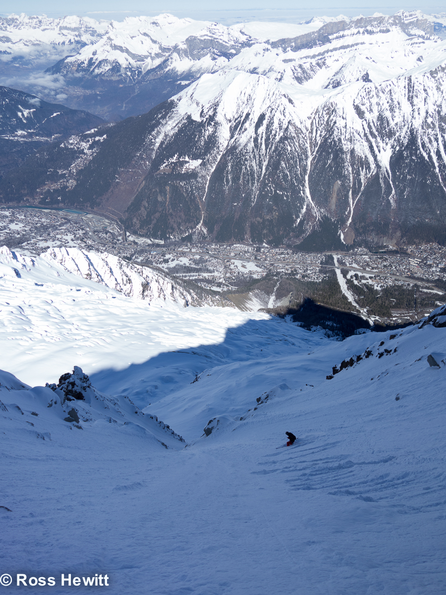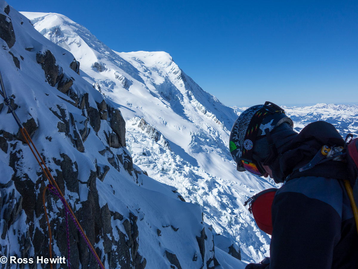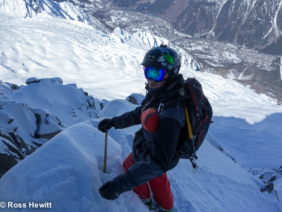 After fighting the queues to get up the lift we were all psyched to get going on a big Midi day and making the most of the fine weather. Drew Tabke has some time off after winning the men’s FWT title and joined Dave Searle and myself. On the way down the arrete I started to feel some discomfort in my back and by time we arrived at the Cosmiques hut my back was seizing up quickly. After a handful of ibuprofen tablets it was time to push on and good skiing took us to the col at the top of the Salopar. By now I was feeling the pain standing still so Dave took over leading and the rope work. The snow was good but with the usual sharks teeth in there to snag the unwary and the straight line exit created sufficient speed to ruffle the ski pants.