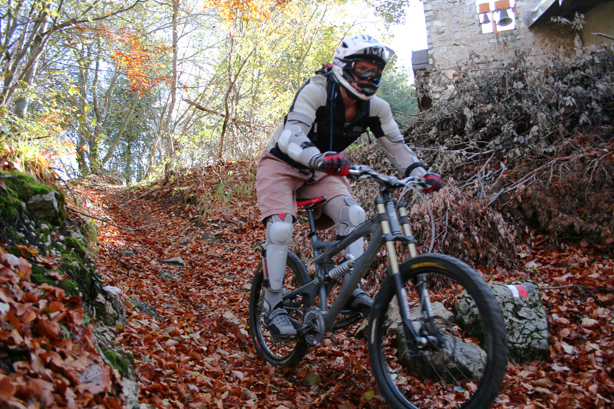 On the infamous 601 path from Monte Baldo. Slippery beach leaves over slimestones polished to a fine sheen by soldiers boots during the World Wars.