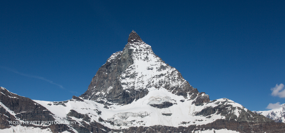 The tip of the Matterhorn was the first thing to be hit by the rising sun and it resembled a blade with blood red streaks on it. This brief morning Alpenglow was soon replaced by a golden light.
