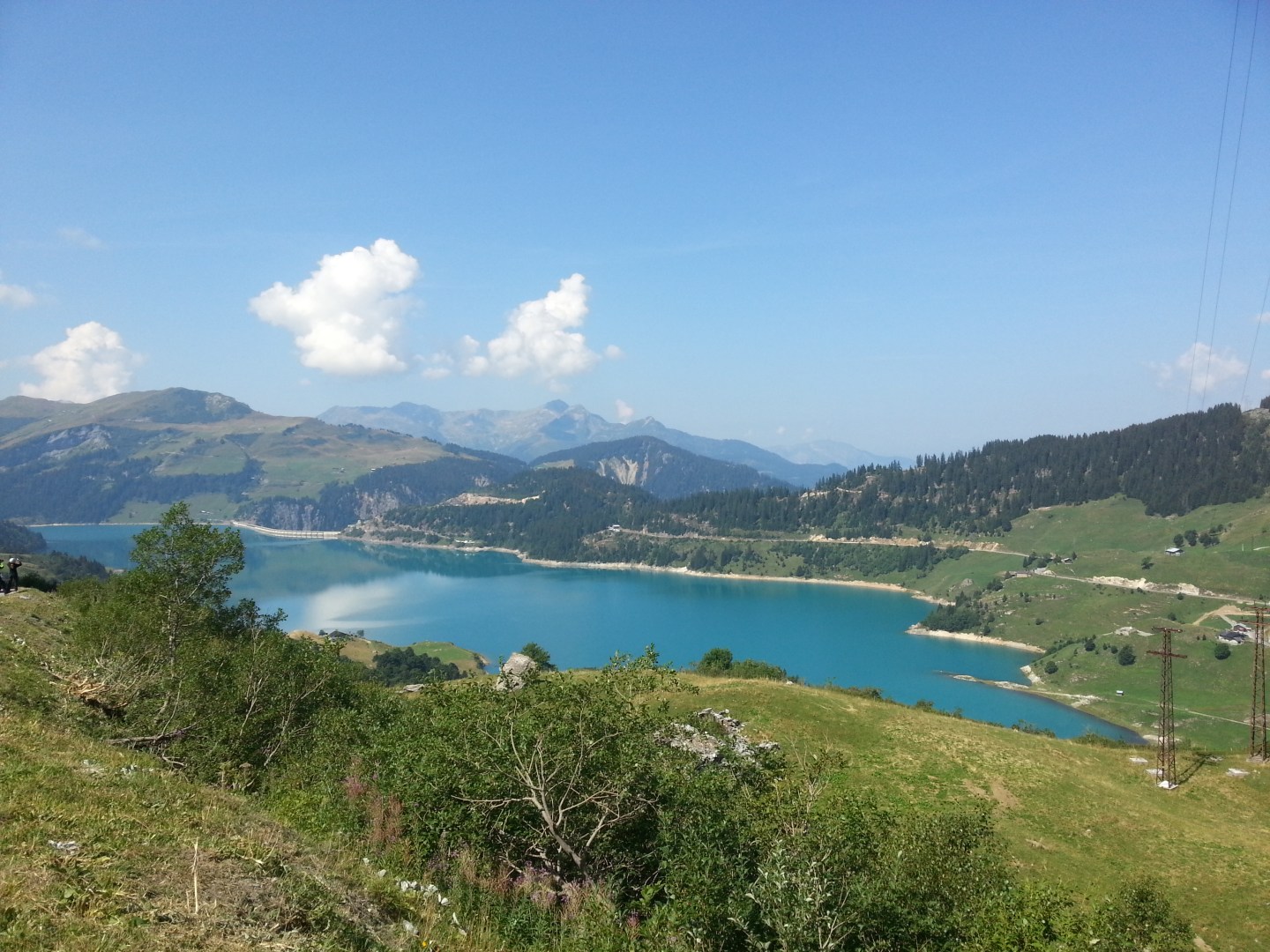 The descent to Bourg St Maurice is long and graded so I just coasted down at 40 mph sitting upright and saving my neck from unnecessary tension. Arriving at Bourg at 3 pm I felt it was time for some proper food and I spotted a drive by MacDonalds on the road. Not exactly proper food but its easy to get down your neck and digest. 2 double cheeseburgers and a coke had me ready for the grind up the Cormet de Roseland. This is a 2 stage climb with a flatter section in the middle. Once gain it was hot in the lower gorge and I could see my heart rate creep up in the 130s and 140s coping with the additional stress. Once out onto the high pastures there was a strong wind coming down from col as usual, and the storm clouds were gathering. At the col I was rushing to get all my clothes on and get down to Beaufort before the storm broke, the weather was better to the West and in the end I avoided getting a drenching.
