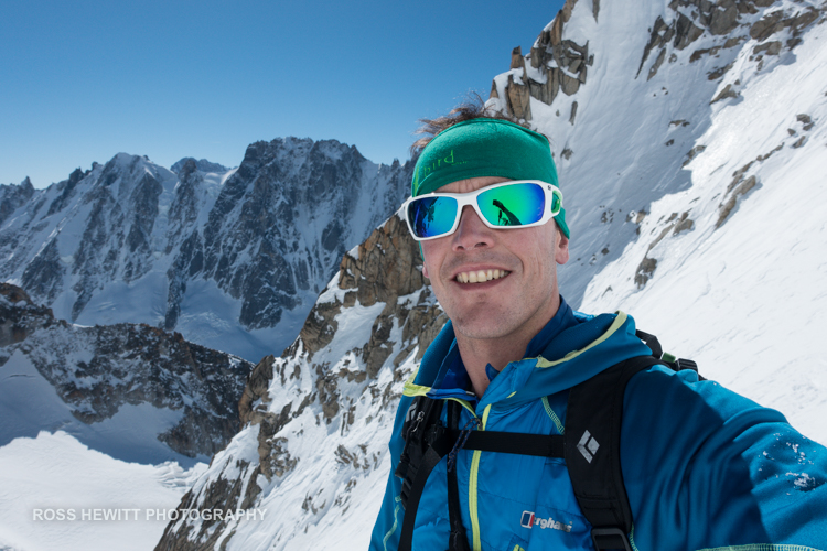 High pressure was still dominating so the next day I went up the Chardonnet for a solo of ski the classic South Couloir. This line is one of my favourites with a good combination of steepness, exposure, spurs, and couloirs all with fantastic views of the Verte, Droites, Courtes and Argentiere.  My acclimatisation was coming back and I was back down for lunch – on the same trip before Christmas in tough conditions it had taken Jesper and myself 5 hours just to get to the bottom of the couloir!