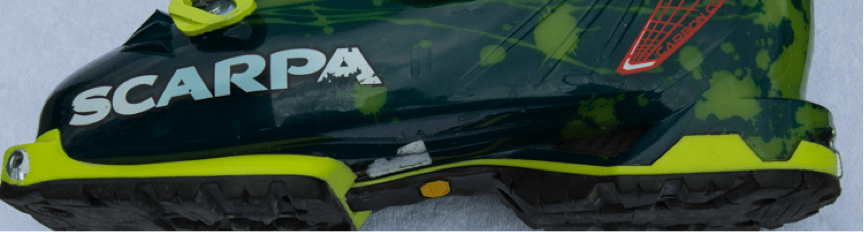 Also bear in mind that a rockered vibram sole is not compatible with traditional alpine downhill bindings and flat DIN soles should be used like those that come with the Scarpa Freedom. Some newer alpine bindings have a height adjustable anti-friction device at the toe that allows adjustment for the additional height between the rockered sole and the top of the toe piece.