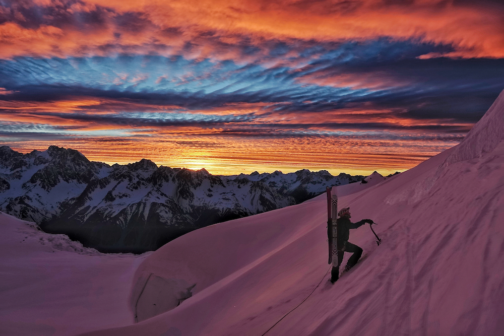 Back in June Smoothy and myself had started talking about collaborating on some ski projects in the Southern Alps but a dry August had me holding back from buying a airline ticket. Finally in September the snow came and when I saw some activity in the mountains I pressed the button on a ticket. After beating around the bush for a while swapping messages we got to the point and started discussing a new line on the 1400 m Caroline Face. This had seen its first descent in 2017 by Grant, Mosetti and Briggs, a trip I had to pull out of at the last moment due to herniating the lowest disc in my spine onto the sciatic nerve root. A big glaciated face like this changes from season to season and when the door on one line closes others may open. To put it in context the West Face of Mont Blanc is similar in size and holds 4 independent ski routes which are rarely all in condition simultaneously. Since skiing 1000 m + faces is in powder is my thing, I still had an interest in the Caroline Face and the opportunities it holds for skiers. That said it pays to be careful who you speak to outside of the steep skiing fraternity as it makes the uninitiated uncomfortable as their pulse quickens, the blood drains from their face and they stare at your through glazed over eyes as if you are crazy. Its just a question of what you are used to and my last runs in my backyard where Couturier, Mallory and the ultra tech steep and exposed Aiguille du Plan North Face. In Chamonix anything is possible but in NZ you need one day when you won’t be ripped off the mountain by then wind catching the skis on your pack. Doesn’t sound like too much to ask right?