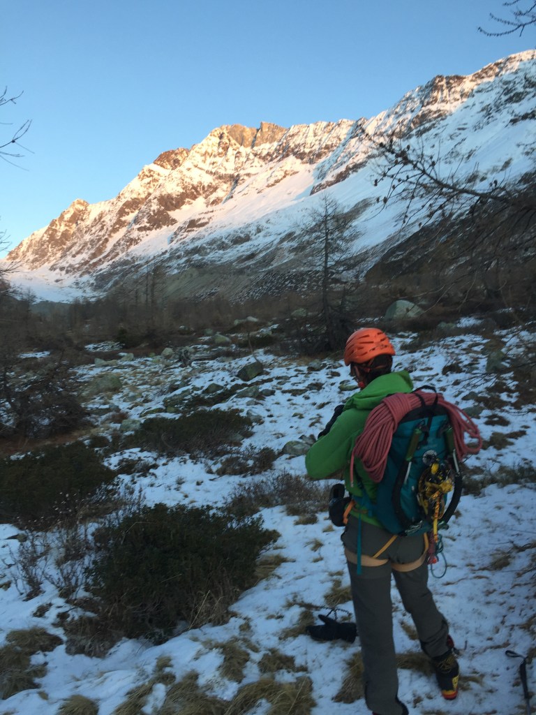 Off we went to Switzerland with heavy bags and light hearts, our spirits lifted by seeing something other than the sides of the Chamonix Valley after a month of lockdown. We planned to park at the roadhead in Fafleralp but to our dismay the authorities had closed the road for winter at Blatten, despite a distinct lack of snow. When the point of the trip was to catch up on lost time in the mountains, whats another 4 km added to the approach?! I usually hate walking as biking and skiing are such superior methods of transport, but after a month at home I loved just being outside and feeling alive in nature. The conversation flowed keeping our minds off the effort and we steadily gained height passing some steep icy grass, only to be forced to wage war on evil crusty faceted glacier snow. Our intention to climb and scope out the first pitch faded with the failing light and we settled on making our home for the night and the lengthy process of melting snow and hydrating.