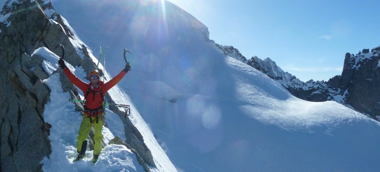 Below the lower crux traverse led through a peppered icy zone to take us to the shrund. All too soon it was over and all that remained was to get well clear of the face which would soon starting shedding thousands of tonnes of snow in the summer heat. We made one short rappel through the lower rock band and then skied back to our camp that we had left 10 hours before.