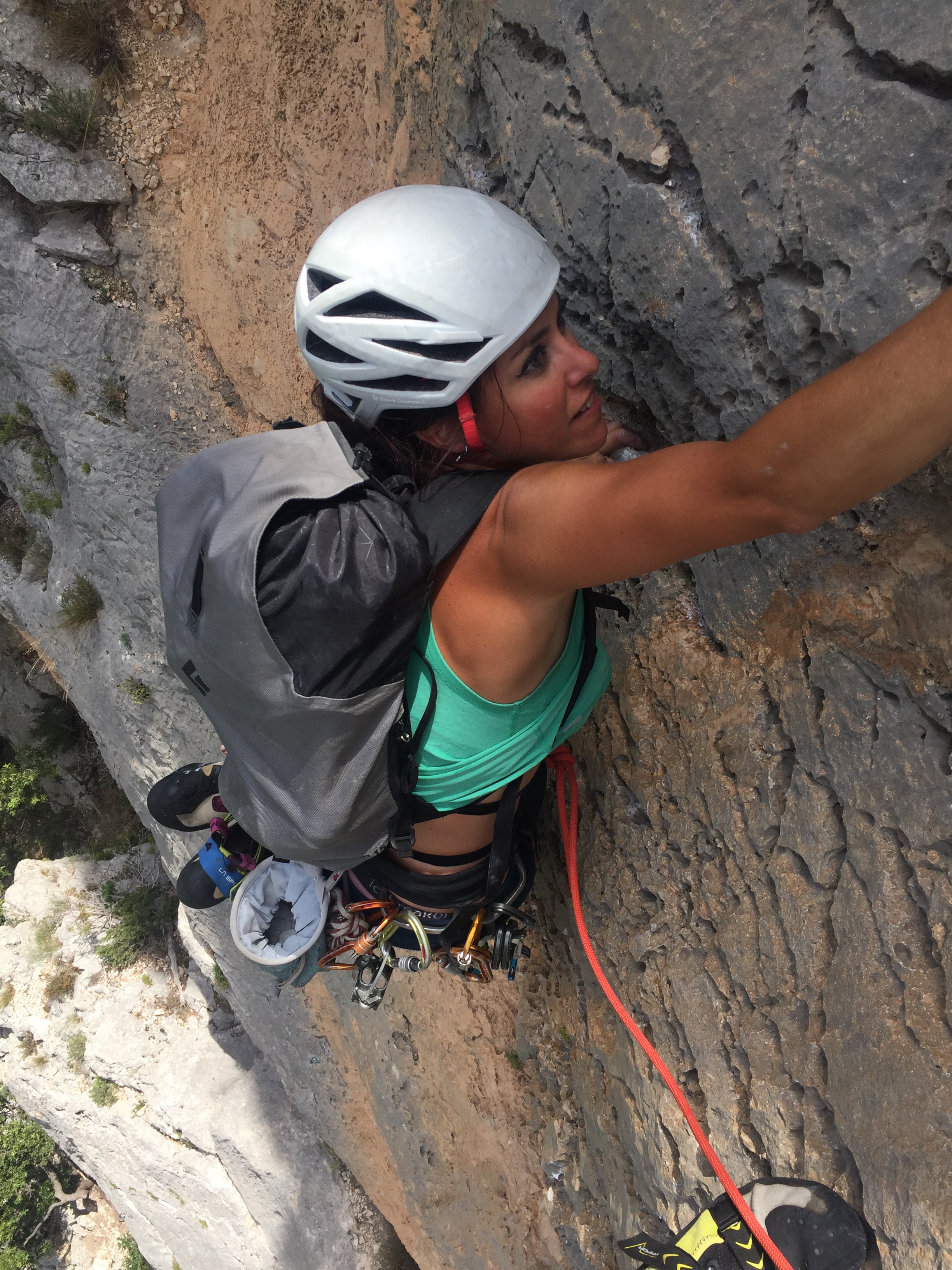 The remaining pitches follow great finger / hand cracks near the left arete, (ignore the bolted slab).
