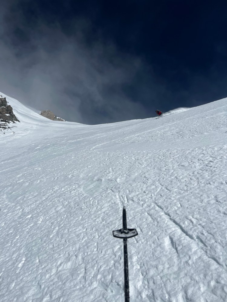 We meticulously stomped out ledges, transitioning to our skis with care. Each movement was deliberate as we double-checked our gear: ensuring the ski bases, bindings and toe sockets were free of ice, and confirming that the boot ski-walk mechanisms were properly engaged. With ice axes in hand, we felt the anticipation heighten, the light rime on the surface, posing a question about how our skis would react during the first turns. Looking down the slope, it remained enveloped in the soft glow of dawn. The initial gully opened up into a stunning expanse of snow, leading to a constriction framed on the right by striking cobalt blue glacier ice, gleaming like a jewel. This corridor led to a vast, open face, that inviting opening it up and surfing effortlessly over the cold silk.