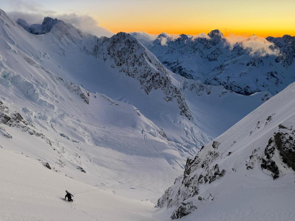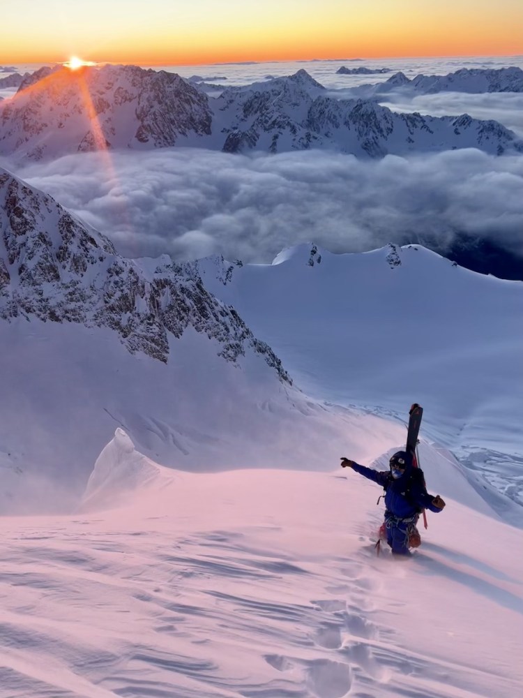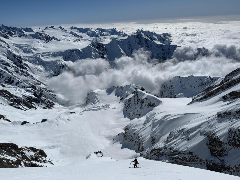 I arrived at the ridge just below the summit and gazed into the Linda cirque. Aoraki loomed above me, its peak rising majestically to pierce the sky, bathed in a warm, golden light that transformed the snow into regal cloak. The last metres consisted of wind-polished blue ice, in stark contrast with the soft, powdery snow we had climbed so far. After a thoughtful discussion, we decided to seize the moment and ski while the light and snow conditions were optimal, rather than risk getting caught in the clouds again climbing to the summit with a deteriorating forecast. We were here to shred subliminal lines, indulge ourselves in good snow and ride making big turns. Reaching any peaks would simply be an added bonus.