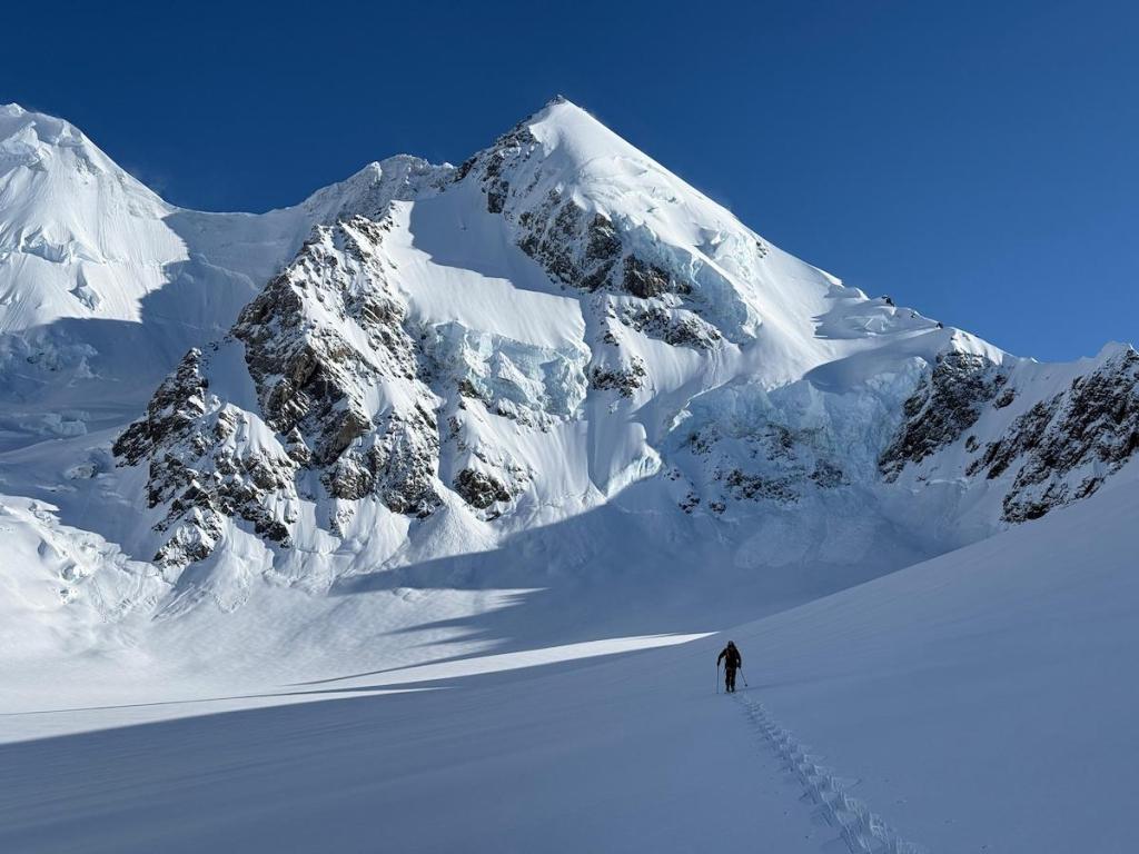 On our first day, we opted to explore the serene beauty of the low-angled Bonnie Glacier, nestled beneath the towering peaks of Hamilton and Malte Brun. We skinned between sunshine and shadow, enjoying the cool of the morning and then the hot powder on the descent, relishing every moment spent outdoors as our circadian rhythm began to adjust to the significant 11-hour time difference.