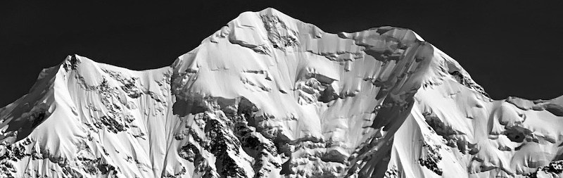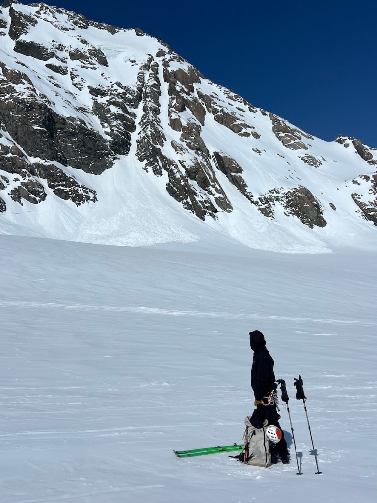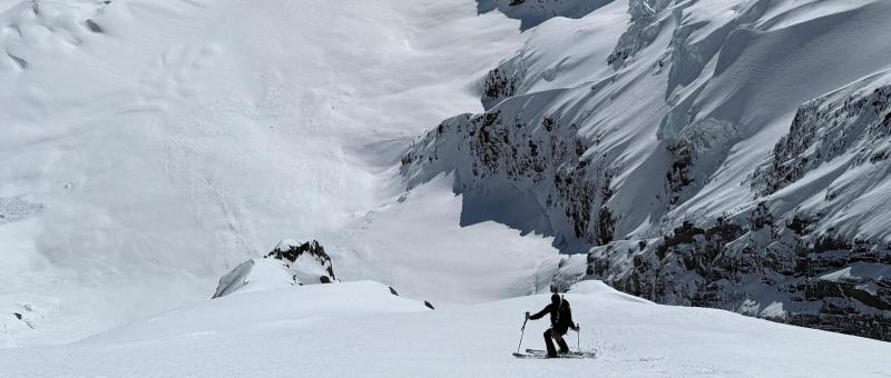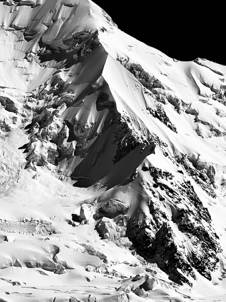 With a pop of my quadriceps, I launch into the air, turning across the fall line. My skis touched down, and the edges bit into the snow progressively, causing me to forget about the slight rime on the surface. What was I worrying about? Filled with confidence, I skied the top third of the line in one go, occasionally probing below me to check the depth of snow over the ice, until I reached the upper snowfield where I could wait for Beau to clear away his sluff. The next section is stunning, the blue glacial ice contrasting against the pristine white snow. We took some time to capture images here before skiing through the choke, where the face opened out to the right beneath the median rock band. Now we could freeride, skiing diagonally to the right as gravity pulled the sluff down the fall line. My skis reached that magical velocity where they pivot effortlessly, surfing effortlessly on the snow surface. Just above the bergschrund, I caught a glimpse of the sluff train thundering down to my right and paused momentarily to let it pass. During this stop, I noticed the ‘Mad Mile’ seracs in the cold light of day, and taking fright, skied continuously to the safety of the Grand Plateau. When Beau joined me, I asked, “Was it worth it?” He, a man of few but measured words, simply replied, “Absolutely.”