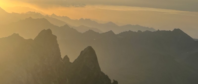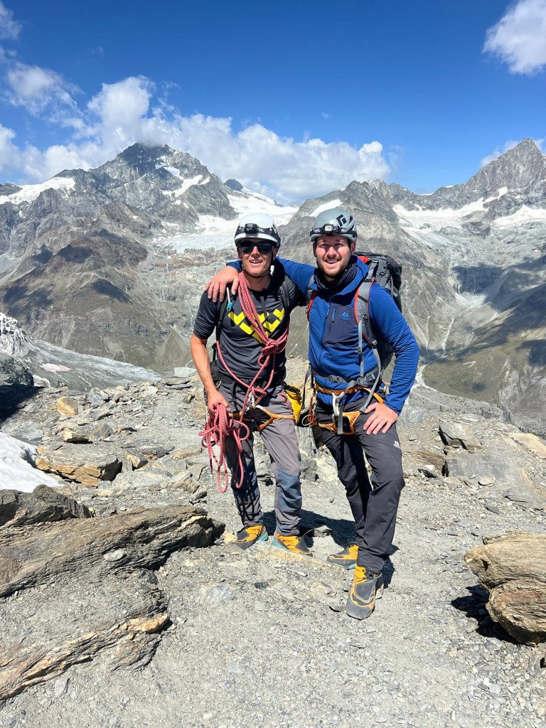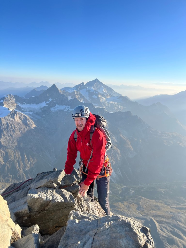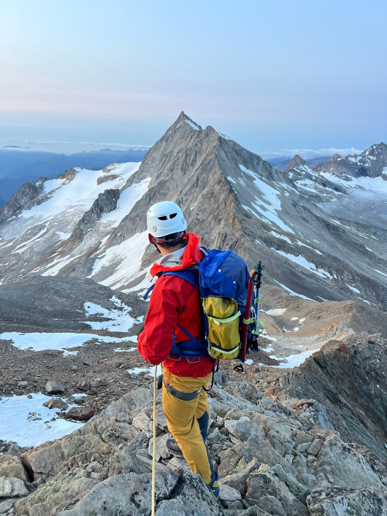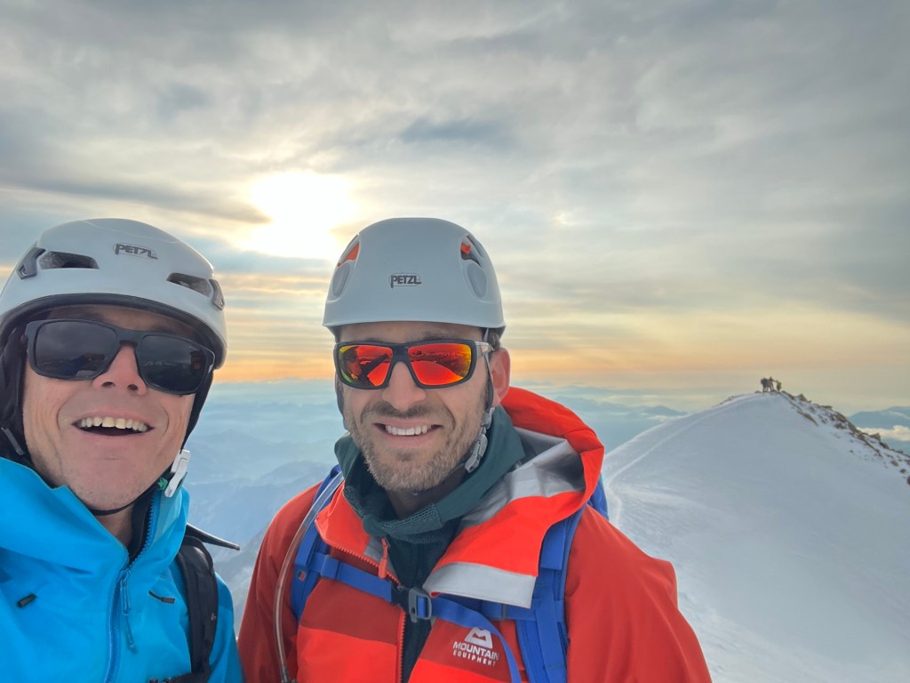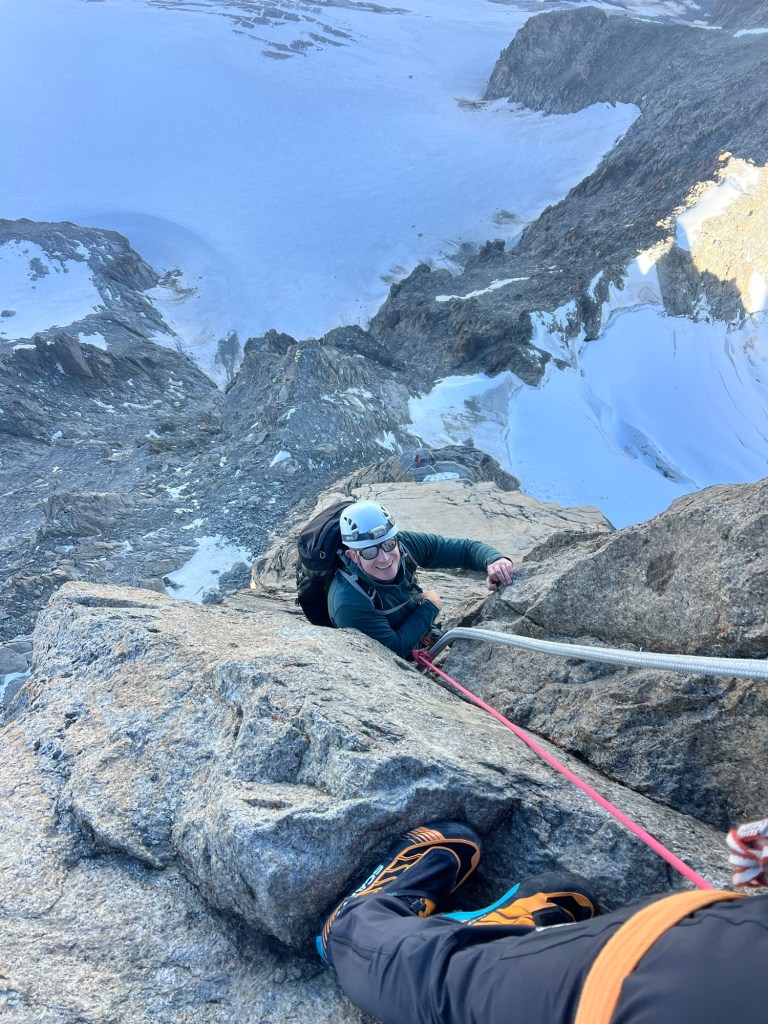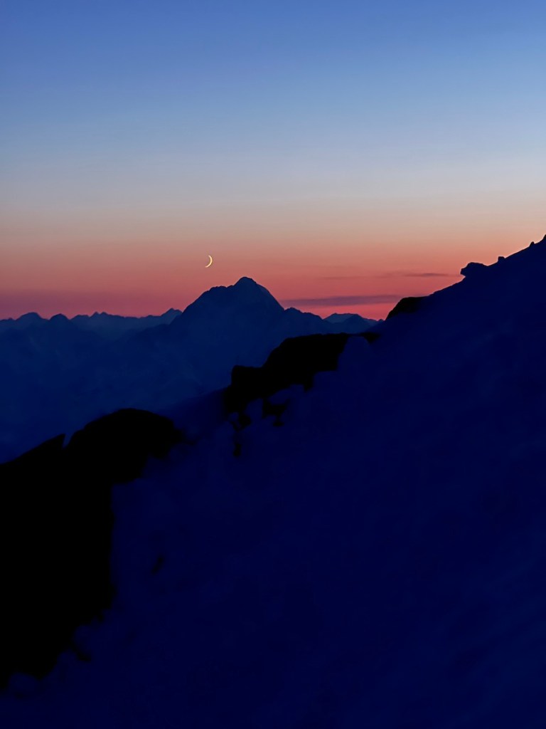 Once we returned to the welcoming warmth of the hut, I took to the kitchen, whipping up a couple of hearty bacon and egg sandwiches to restore the energy I had expended racing up Dixon. With the scent of food enveloping me, I quickly fell into a deep, replenishing sleep. As the evening unfolded, the glow of the setting sun filtered through the windows, and we gathered to discuss our plans for the next day. Our visions diverged; Beau had his sights set on Syme, while I leaned towards Silberhorn, drawn by its easier accessibility and the ominous forecast predicting a similar cloud build-up. Eventually, after Will shared his stunning photographs from Silberhorn, Beau was convinced it presented a worthy objective. From my cozy bunk, my gaze shifted from the Cook’s East Face to Silberhorn and I memorised some key features and took a compass bearing of our approach route before setting the alarm for 2 am and dozing off.