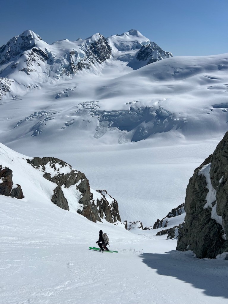 Fuelled by our newfound insights, we set our sights on Darwin’s North Face—an elegant, 800-meter steep couloir that gracefully opened into a vast snowfield, leading up to the summit ridge. The allure of this remarkable line was irresistible, serving as the perfect warm-up for us to rediscover our skiing abilities after an entire summer spent guiding alpine adventures in the Northern Hemisphere.