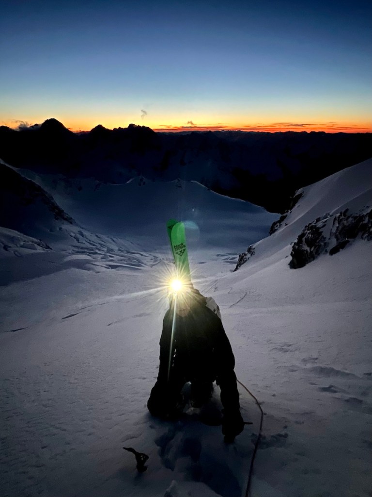 We continued hugging the left side of the bay, using the terrain above for protection and avoid drifting into the treacherous right side in the inky darkness. As we skinned across a large crevasse, the slope steepened markedly, posing challenges for our climbing skins. In the soft, pre-dawn gloom, we could barely discern two snow slopes above, each potentially our line. Neither of us had anticipated such difficulty in determining the start of the route. A wrong decision at this juncture could cost us precious calories and, more critically, valuable time—an increasingly urgent concern with clouds threatening to roll in by mid-morning. A swift glance at my phone revealed the dawn was nearly upon us, prompting us to transition to crampons and our magic carpet snow plates while we waited for enough light to reveal the correct path.