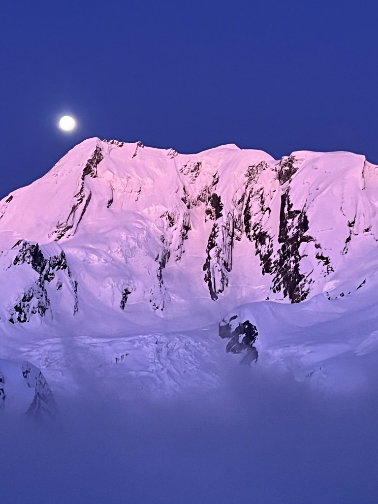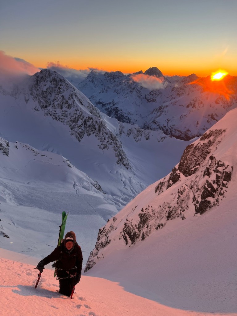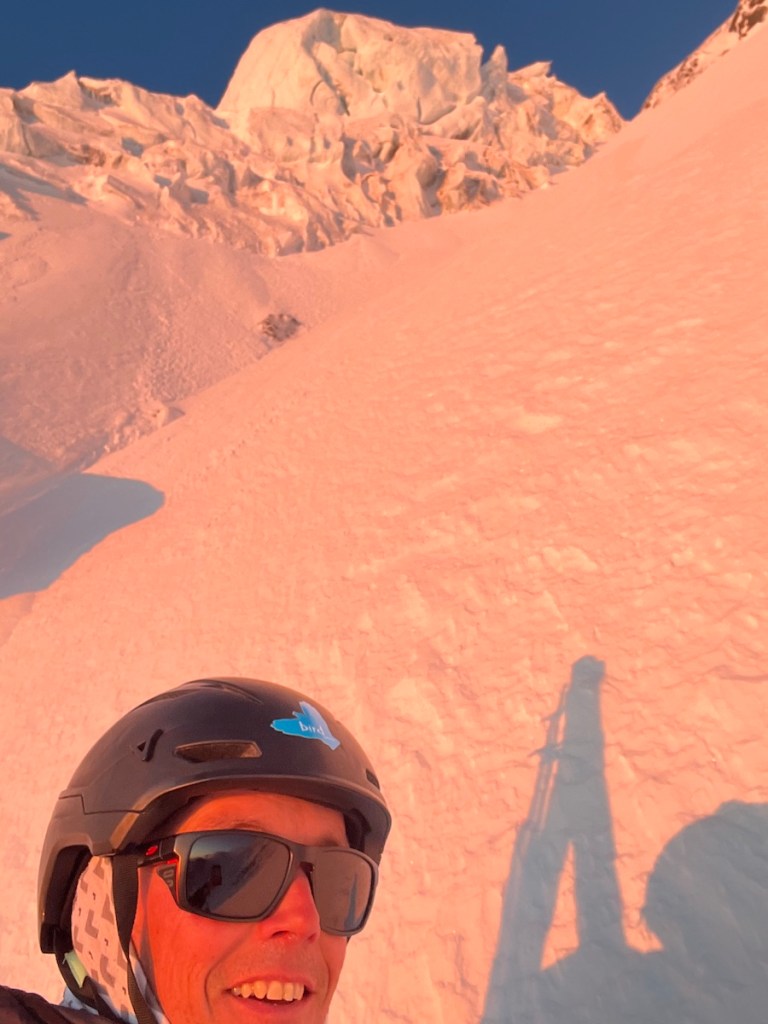 Now it was my turn to break trail, and in the grey half-light, I made good progress through the boot-deep powder. The horizon was ablaze with vibrant shades of red, a fleeting transition that bled into a soft blue sky that deepened with altitude, hinting at the marvel yet to come. As we approached the imposing serac, the sun finally broke free from the horizon, casting a warm, pink glow across the mountainside in a breathtaking display of alpenglow. We found ourselves momentarily frozen in awe, captivated by this extraordinary scene. In that moment, we pulled out our cameras, determined not to let its beauty slip away into memory. Those first rays of sunlight were a comforting embrace, offering a relief to our frosted extremities that had been suffered the biting cold in silence until now.