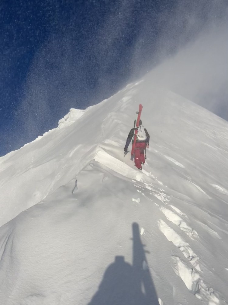 The combination of excitement and nerves heightened my awareness as I shuffled my weight from ski to ski, building my proprioception, eager to get started. With a nod from Beau confirming he was ready, I slid over to the spur on the right, knowing that my edges would need to bite through the slightly rime-covered surface. When the snow is perfect, it’s easy to ski; however, with inconsistencies like rime, crust, or underlying ice, there’s a lot of tension until you make that first turn and come through it feeling confident about your margins. It’s similar to a triathlon when a participant transitions from the bike to a run, often coming out wobbly, transitions can be challenging, especially when you’re working near your limits. On top of that, ski mountaineering brings added factors like sleep deprivation, high altitude, and significant deficits in calories, water, and electrolytes.