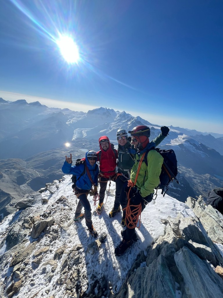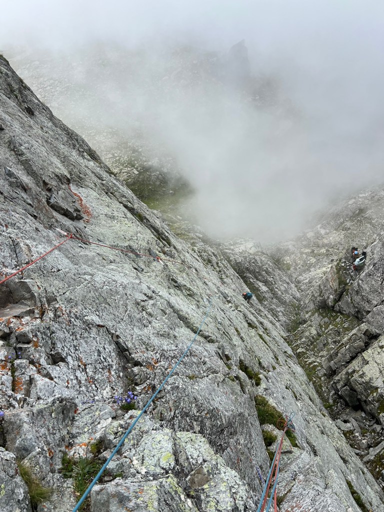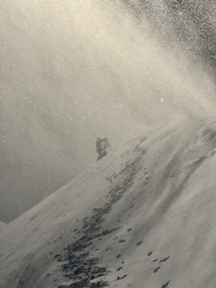 The next day we had only just left the hut before drama unfolded: a serac on Silberhorn gave way, unleashing an explosive avalanche that charged across the plateau, crossing the track we had followed. It was a stark reminder of the mountain’s power — if we ever needed convincing to steer clear of the larger faces, this was it. For the remainder of the trip, the wind howled around the hut relentlessly, eroding inclination to attempt the daunting challenge of Syme, its allure slowly fading under the weight of nature’s fury.