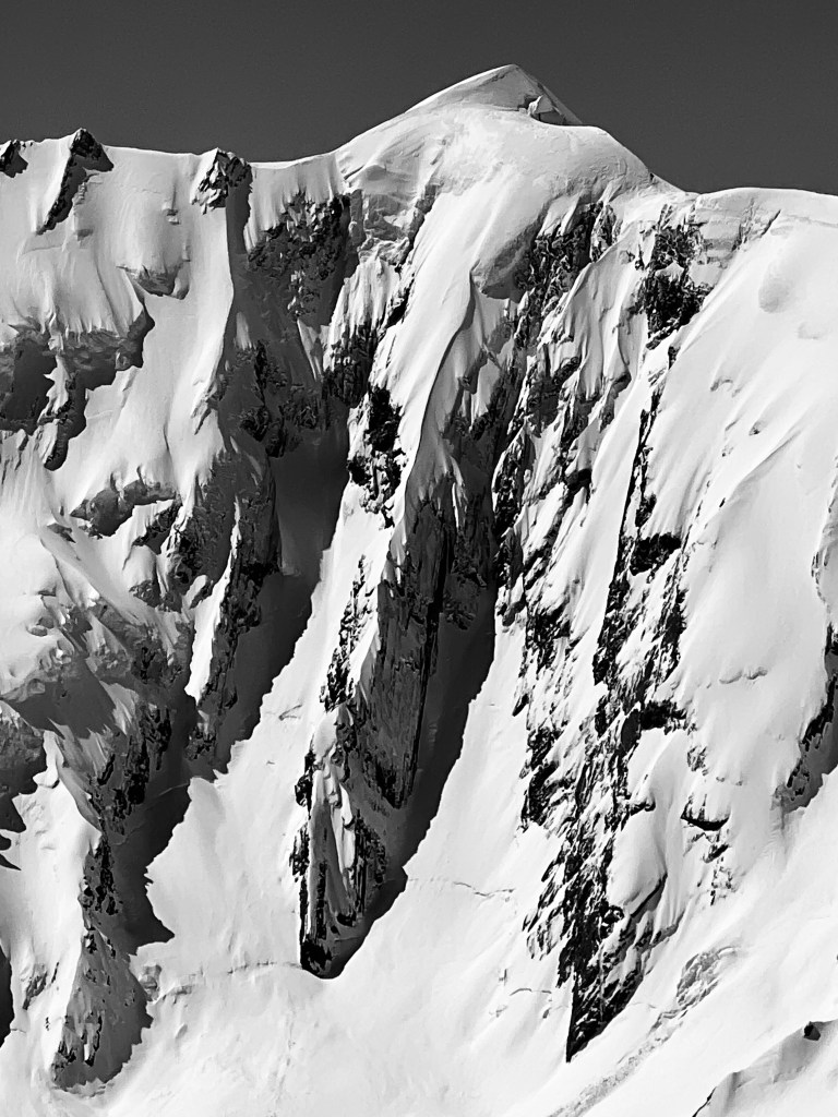 Silberhorn’s winding South East Ridge is a captivating path, marked by a rock band that has grown over the years, a testament to the retreat of ice in our lifetime. For those seeking a sublime ski, it is the elusive East Face that calls out seductively, enticing skiers with its steep, pristine snowfields, interconnected by narrow couloirs that plunge directly from the summit. To unveil the hidden elegance of Silberhorn, one must ascend of either Dixon or Syme to secure a striking viewpoint.