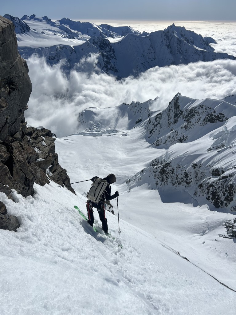 Fast forward to the present, and I found myself once again at Plateau Hut, this time accompanied by Yellowstone guide and New Zealand ski veteran, Beau Fredlund. The atmosphere was brimming with excitement as we were joined by the my good mate Will Rowntree and his trusted partner Sam Smoothy, along with another team comprised of Christina Lustenberger, Guillaume Perell, and Mathurin Vauthier. The air was buzzing with anticipation; we were eager to seize the fleeting weather window that lay before us and set out for Dixon. We made quick work of the climb, our hearts pumping with adrenaline as looming clouds threatened to blanket Marcel Col. Just before reaching the summit, an eerie shroud of mist descended upon us, transforming the world into a monochrome landscape where visibility shrank to mere retracing our ascent route by carefully following our boot pack, intimately aware of the precarious nature of our surroundings. This was my fifth attempt at summitting Dixon, each time failing due to summit slopes consumed in cloud.