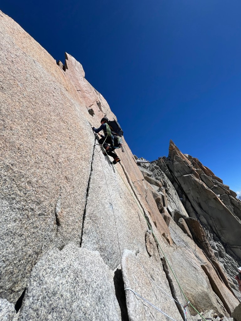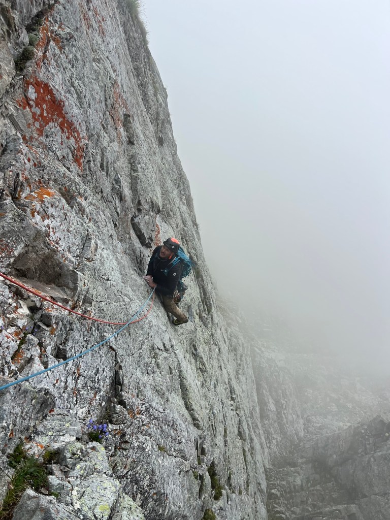 After a short night, we found ourselves stepping out of the hut and into the inky blackness of the night. The humid air crystallized into delicate diamond dust, sparkling like stars as it caught and dispersed the lights of our headlamps, creating an otherworldly atmosphere. Familiar landmarks transformed into ghostly shadows, and not even the outline of the mountain was visible against the night sky. Surrounded by darkness, I pulled out my compass, navigating by dead reckoning relative to a star’s position. As we entered a crevasse field we began to meander, forced to rely on GPS for guidance. This slower enforced pace allowed the piercing katabatic wind, which felt like icy fingers, to creep through my layers. Soon, I donned all my clothing and cranked my electric socks, desperately fending off the cold.