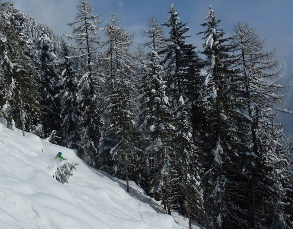 Yesterday it snowed lightly throughout the morning and with sub optimal visibility it was definitely a day for the trees. The previous day we had gone up the Midi in the morning window to find the snow trashed by the wind and slabs everywhere. After successfully navigating the hazards on the first 3 pitches of Grand Envers we traversed off above the Requin to the Salle a Manger to avoid more windslabs and stress. The trees provided awesome skiing and we harvested the area we were in each time taking the fresh line adjacent to the previous one. Pillows, spines, gullies, trees were all skiing Alaska style, we were having so much fun, still taking care to ski one at a time on the steeper pitches and stand on spurs/safe points. The final run was down a drainage line with a steep entry traversing through thick trees. Once in the gully itself the angle eased off alot and we skied more one pitch maintaining usual discipline. As the angle eased below 30 degrees I was having fun and skied past the others and continued down the couloir for about a kilometre, skiing fast, drifting the turns, launching off spurs and enjoying the playful nature of my skis. About 200 m from the bottom I glanced over my shoulder one final time to check the slough and glimpsed a powder avalanche ripping down the line about 100 m behind me closing fast, so I cut out left into the trees. The snow was very light and cold and we’d already witnessed the trees drop snow which had set sloughs running, and my own slough could have easily gone airborne in these conditions. I didn’t think much off it as I waited for the others and Philip soon called out from above. I assumed he was just checking I was below and hadn’t veered off into new territory but he then called my phone with the news that he had been caught in a powder lanch, pulling his airbag, smashing off a few trees before coming to a rest ontop, his skis gone. Paul had also been caught and buried up to his chest. Initially it was a major worry for Philip that everyone had been caught but as the girls descended from above everyone was soon accounted for and the group were all ok. As I waited for them to descend towards me 2 young lads came down and stopped in bed of the couloir. I called them over and explained an airborne lanch had come through here which didn’t seem to register with them. Asking if they had seen my friends they confirmed they had skied past the carnage without noting what was going on. Neither had Arvas or backpacks. As my friends joined me the 2 lads offered to go back up and sweep the line as they had noted one of Philip’s skis javelined in above. Trying to explain that they should have transceiver,shovel, probs seemed to be lost on them as they went for another lap promising to return Philip’s ski if they saw it. We needed to get down to safety quickly before everyone got really cold. Before heading off we saw a snowboarder bimbling past, looking out of place in the terrain, and uncovering one of Philip’s poles without noticing. It had carried some 500 m in the blast and dropped out of the aerosol just next to me.