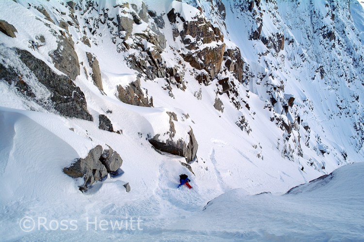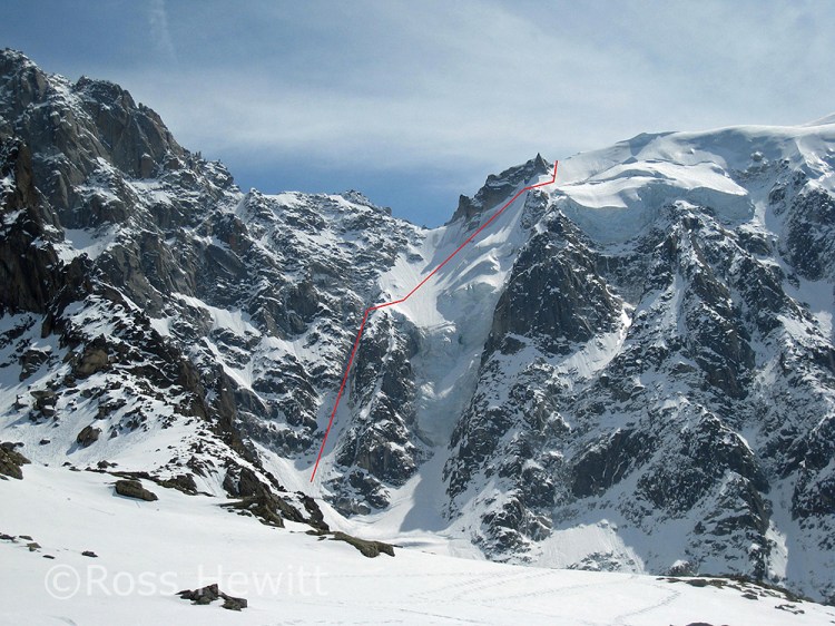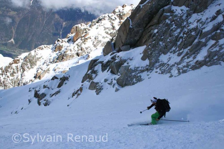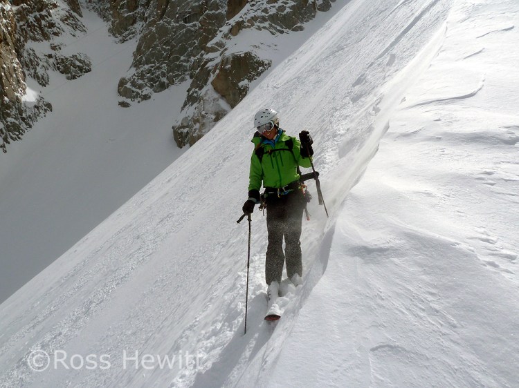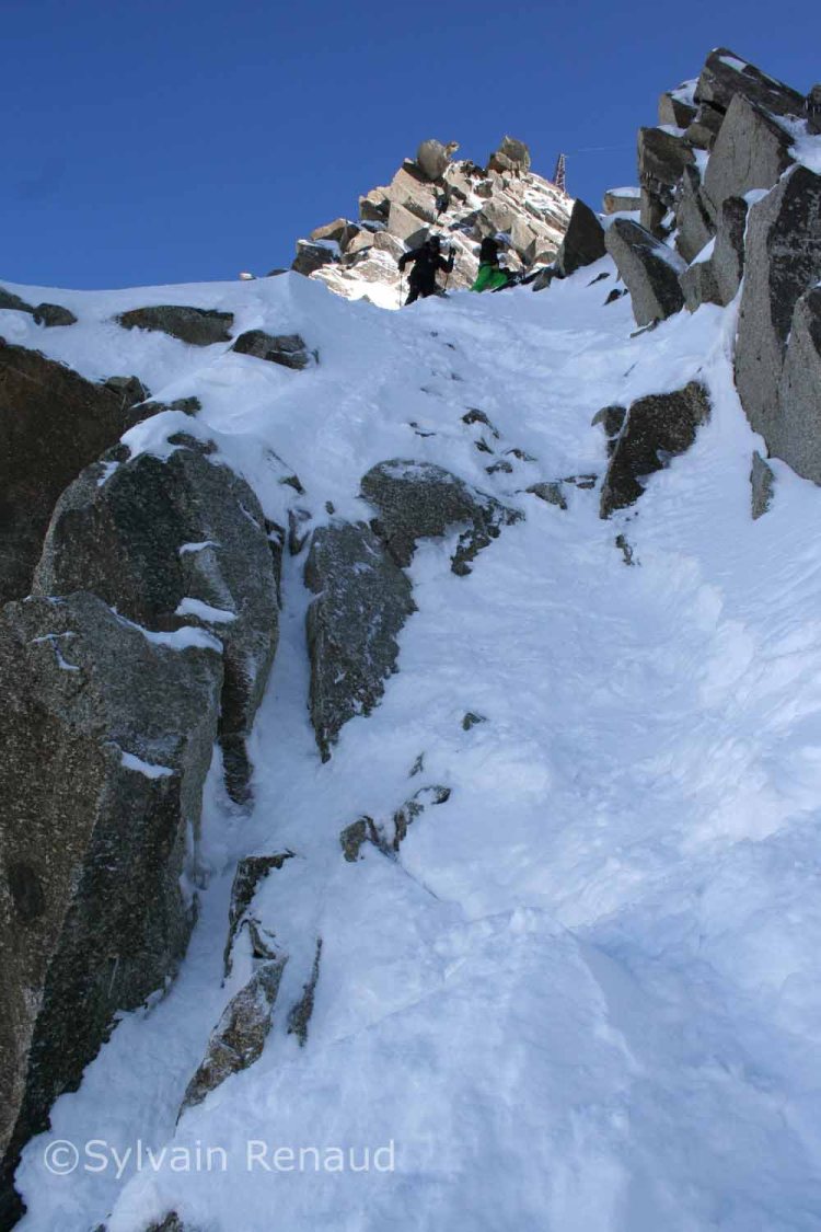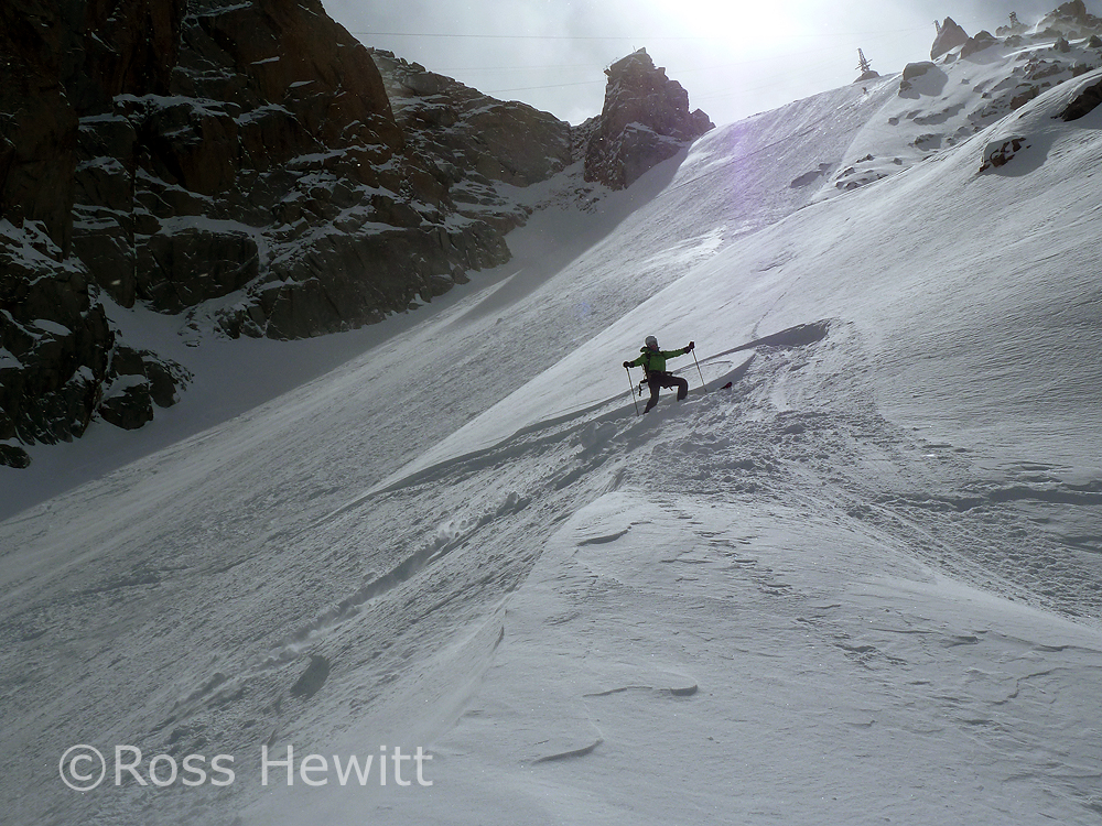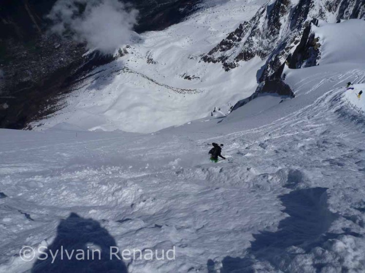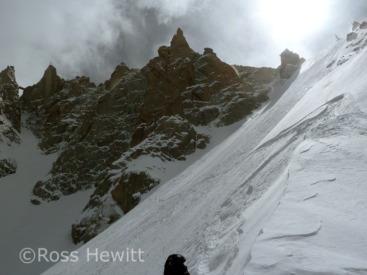 Start of lap 2 skiing down the North Face side of the arrete. The speed flier standing next to Luca sadly paid the ultimate price on his last run. When we came round the traverse his body was being recovered by the PGHM in the avalanche cone. Our condolences go out to his family and friends.