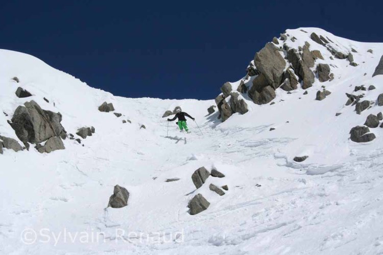 Monday saw the usual gathering of steep skiers at the Midi hungry for those oh so ephemeral routes that come into condition for just a few hours of perhaps one morning a year before the sun strips the snow off them. There is the usual stress with the potential for everyone to pile into the same place. A French team go into the Mallory which looked good but only 2 small snowfalls have covered the glacial ice on the upper slopes. Col du Plan’s ice is also showing so Luca Pandolfi, Sylvain Reynaud and myself head to the Rocco. This is the Rond entry to the Cosmiques, often rocky but good right now and a variation that I hadn’t done.