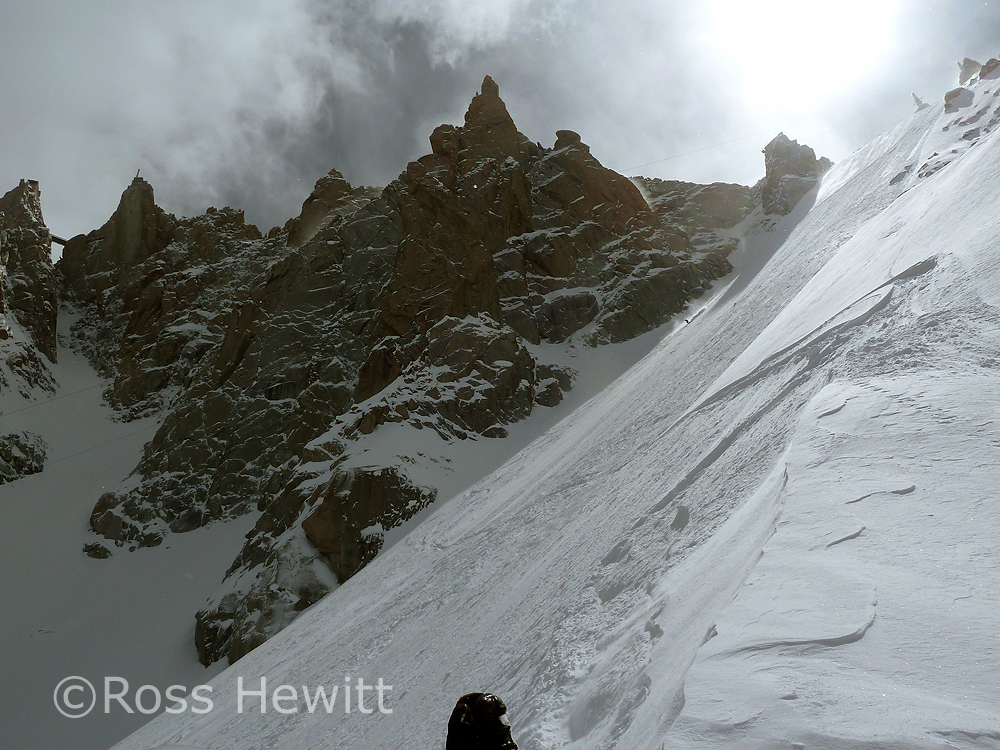 Walking down the Arrete the mist started to part revealing a pristine sparkling wonderland with its new coat of pow. I never fail to feel a twinge of excitement going to ski on the Midi. Unlike a ski resort the Midi offers adventure, doubt, excitement (read sphincter twitching fear), risk and reward. You end up skiing in outrageous places – the stuff dreams are made of.