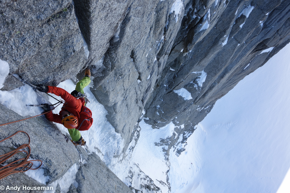 Tom having a ‘mmmh, yeeaahh, sick’ moment to himself above. Andy and Tom breaking trail with the Jorasses and Calotte