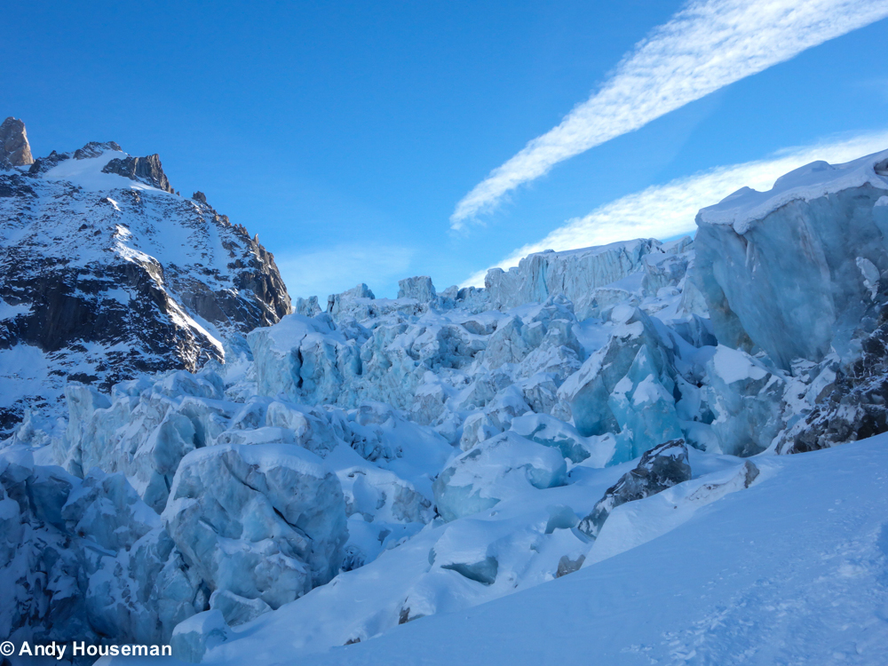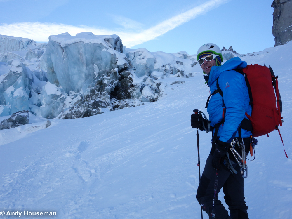 Yesterday I had the pleasure of climbing with my good friend Andy Houseman on Pinnochio which lies on the East Face on Mont Blanc du Tacul. For some reason we haven’t climbed together for 4 years, I guess I’ve been concentrating on skiing while Andy has been doing expeditions. We had both climbed Pinnochio before in 2007 and this time round in was a lot thinner and more sporting but still amazing climbing, some of the best day hit modern mixed climbing I’ve done in Chamonix. It was a mild, windless day, absolutely perfect alpine conditions. After we decided to ski down through the valley blanche for the first time this year which was sporting but ok.