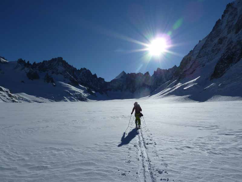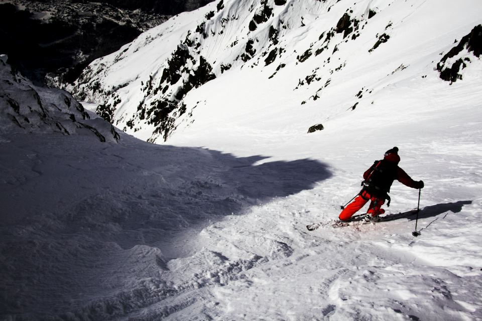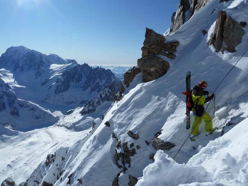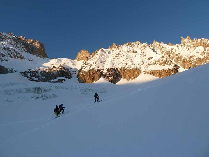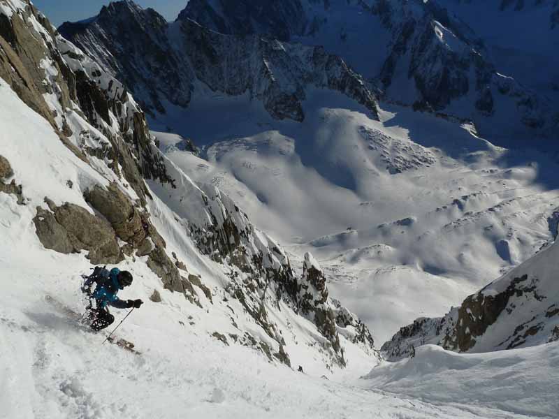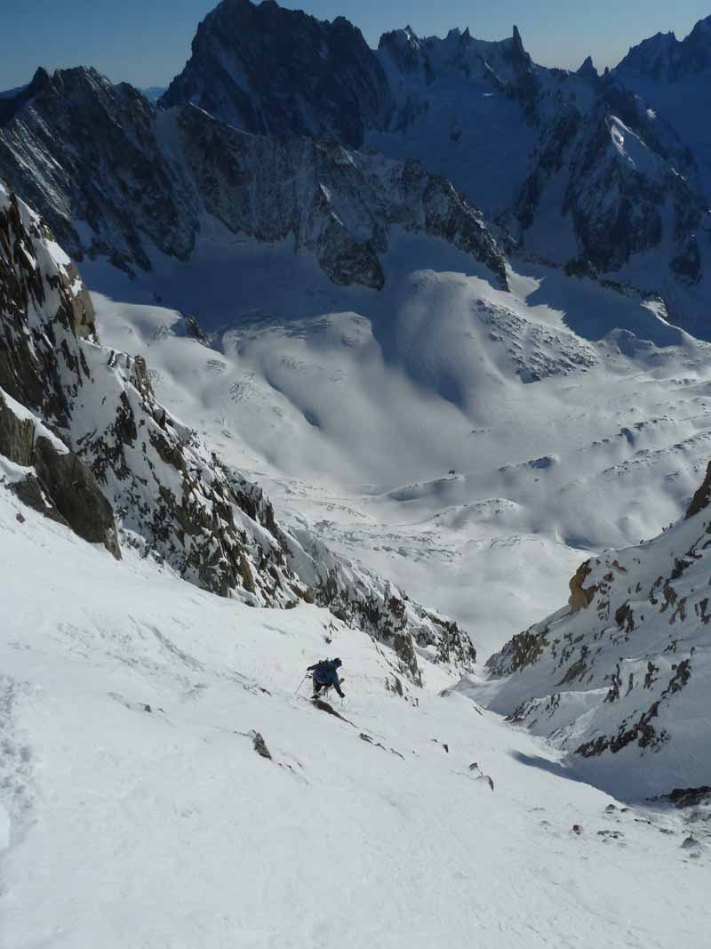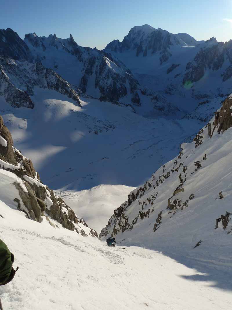 A quick rap, skis on and Ryan set off down. Very variable snow that didn’t look easy, he handed the lead to Cedric. This made me nervous but I told myself I would just take my time. The two banks are different aspects with different snow combining old pow, icy crust, lumps, bumps, rocks, facet holes and all steep in excess of 50 degrees. Ryan usually telemarks but took alpines for the day to have rigid boots for the climb up. His jump turns were impressive with all that telemarking quad power, like zebbedie out of ‘The Magic Roundabout’. Alot of you are probably too young to know what I am talking about so imagine someone on a pogo stick going airborne. My legs were pumping just standing still on my edges let alone blasting upwards into orbit! As we descended the snow became deeper and more consistent and bigger powder turns took us out of the couloir, down the Talefre basin and the Mer de Glace as the peaks glowed red in a magnificent sunset. We rolled into town at last light after a superb technical day out.