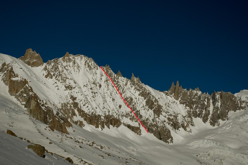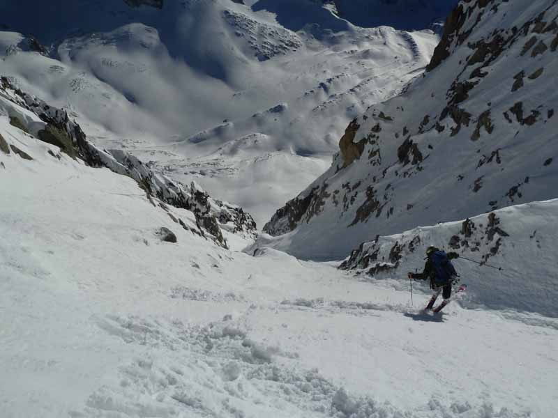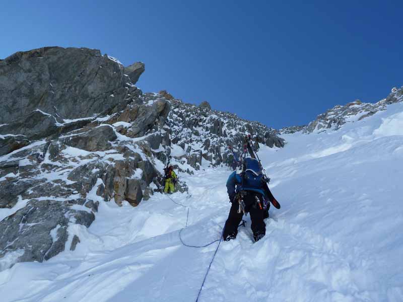 Nearly a year ago I attempted the Angelique with Dave Searle a couple of days after Andreas had repeated it. The south facing stuff wasnt in particularly loaded in this low snow year but neither was anything else and we had nothing better to do. With valley temperatures hitting 20C at the time we knew we would have to be quick and get to the top of the Courtes for midi from the first GM bin. At the bergshrund 2 snow bridges collapsed on me and third attempt lucky and a loss of 45 minutes we were on the NNE slope going up as fast as we could with heavy AT kit. The snow was variable with undercut slabs, facets, neve, ice, powder, anything but something useful. Toping out at 1 pm was akin to looking over the crater of a volcano and we could see the snow was turning and we needed to get going fast. The beta we had was 2 short raps and you could ski, 30 m down and I spent about half an hour pulling off loose flakes and crumbling rock to get an anchor, Andreas’ anchor another 20 m below. A couple more raps we stamped a ledge in the snow and put on our skis, 30 cm of wet snow, lots of rock showing below, rocks falling and the sun beating down. Dave and myself hadnt done that much together and I wasnt sure how I was going to sell him that this wasnt on and we needed to climb out and downclimb the NNE. We were too late for an alternative south facing descent off Les Courtes so it was back down the NNE slope, reversing over all the undercut steps the wind had created. Two climbers appeared above from Swiss route and we got lumps of snow knocked down on our heads. We were moving faster so there wasn’t much point waiting for them to catch up. We just had to take this disconcerting feeling as each lump hit you on the head. About 300 m above the shrund I’d had enough of down climbing and finding a strip of pow skied the lower 48 degree section to the shrund. We arrived back at the car at dark not very pleased with a day when most things went wrong.