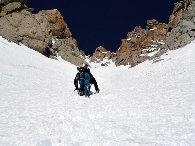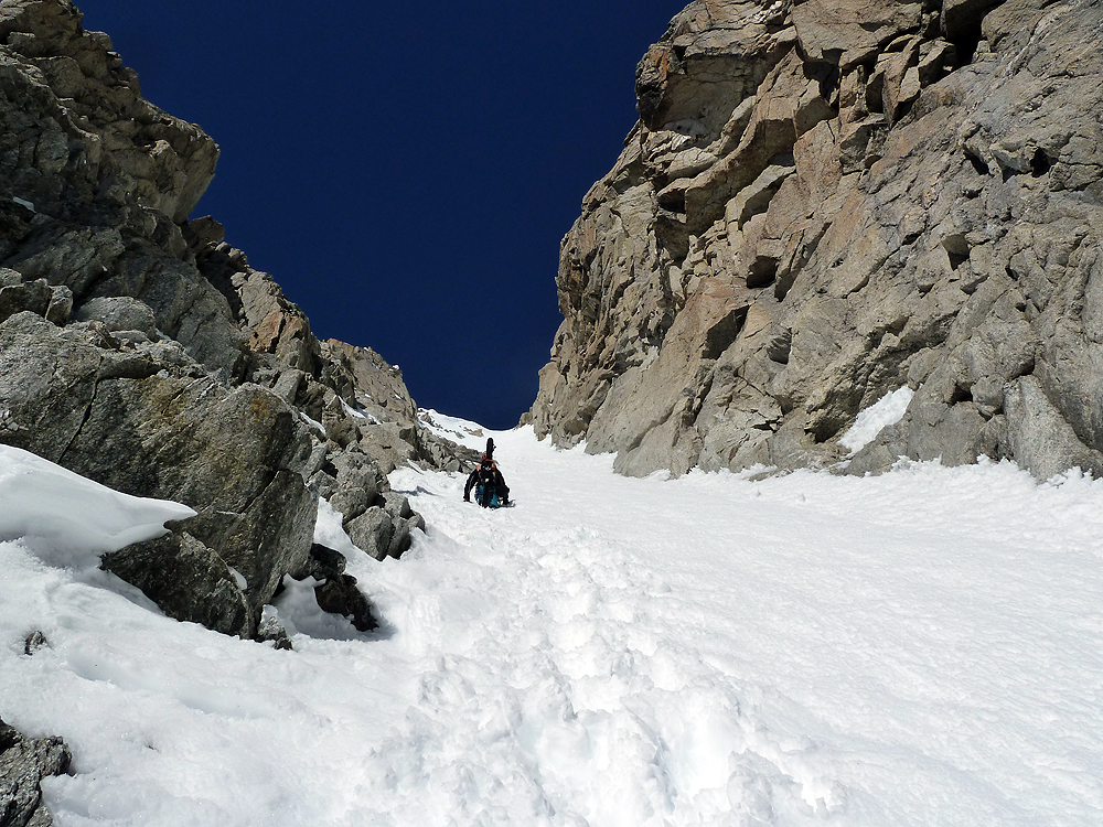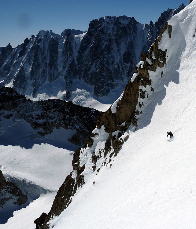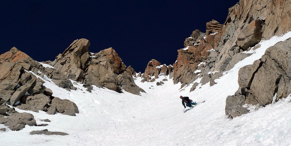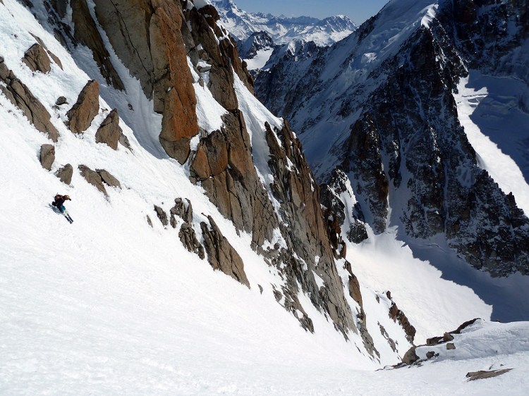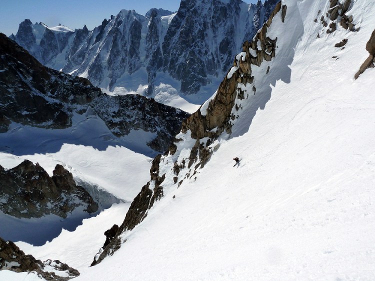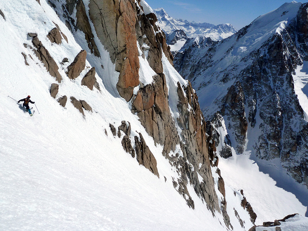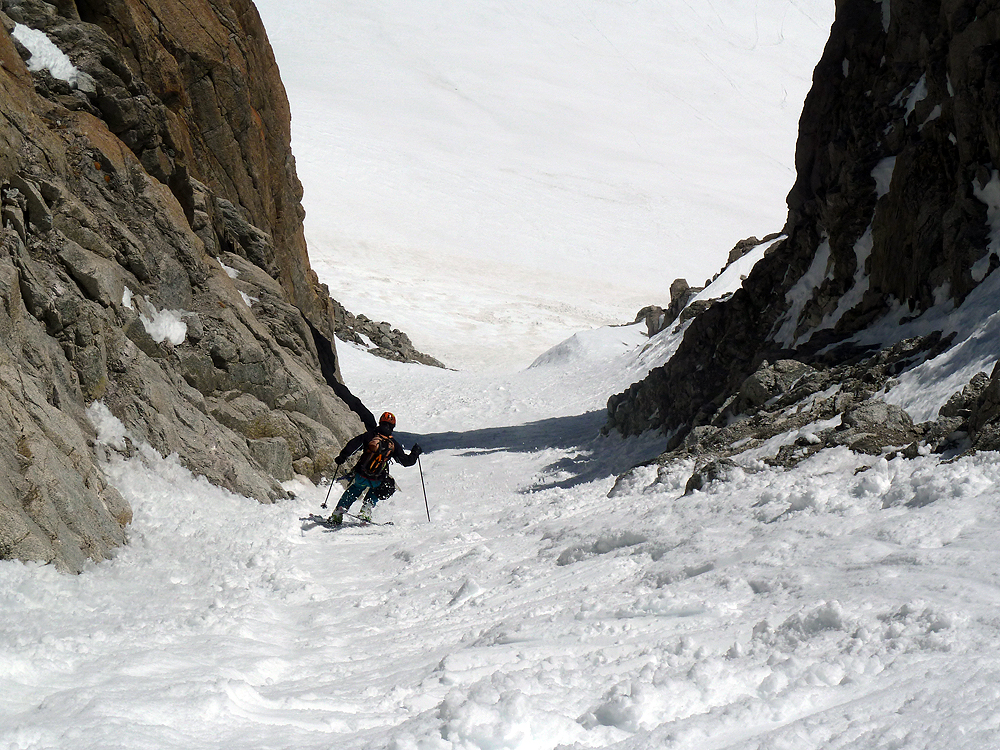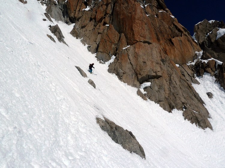 On Christmas Eve I had the pleasure of skiing with Jesper Petersson and returning to the Argentiere basin. We skinned from Bochard over the Col des Rachasses towards the Col de Chardonnet to have a go at the South Face. Rotten snow meant getting off the Argentiere glacier was really tough and we had been going for 5 hours by the time we got to the face. The weather was changing rapidly and by the time we climbed the initial couloir the wind was howling, tugging incessantly at the skis on our bags trying to lift us off the mountain. The decision to ski down was pretty simple!