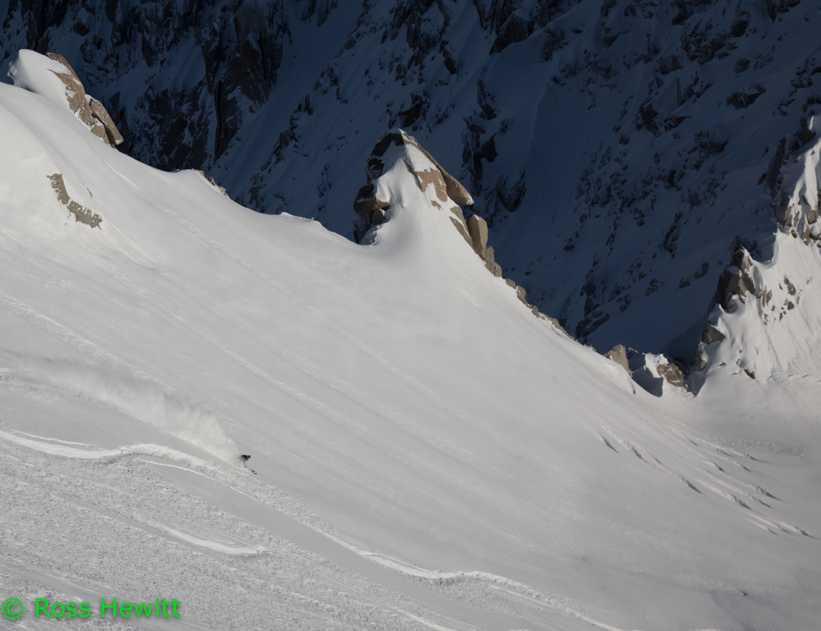 Jim Lee slaying Grand Envers in a metre of fresh. Aiguille du Midi