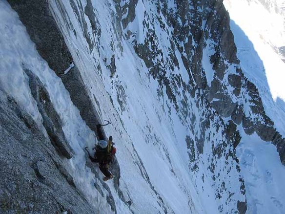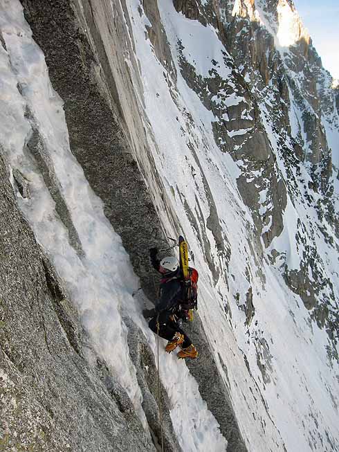 When Ez and myself decided to do the Colton Brooks we had already done a few day routes and so were working well as a team and were fully acclimatised. We wanted to get up and over quickly, which isnt an issue for a man like Ez with his national level of fell running fitness, but we also took skis to get down to Cham quickly. The climb is one of the most esthetic lines I have been on, never hard but the ephemeral streak of ice taking you through stunning and improbable terrain under that enormous shield of rock is a fantastic journey. We took four ice screws and moved together the whole way, only slowing momentarily when Ez decided that he didnt want to risk his new screw bottoming out in some shallow ice and would retrieve it and place one of mine. He then proceeded to fumble and drop his new screw in an ironic karma moment.