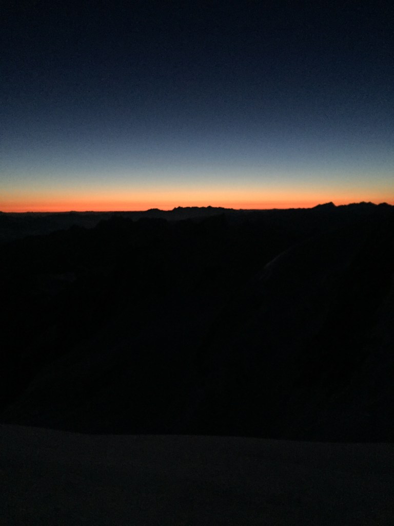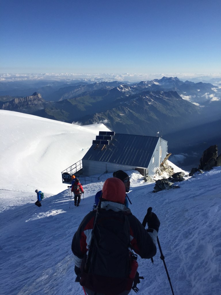 Mont Blanc summit and ski guiding trip. This was Mont Blanc the historic way, the pure way, human powered from the valley floor from my house (ancienne Maison Balmat) -which is where Jacques Balmat lived at the time when he made the first ascent of Mont Blanc in 1786! On the first day we made the approach to the Grands Mulets refuge by the Gare des Glaciers and enjoyed a massive feed and relaxing stay with the friendly atmosphere. We left at 5 am the next morning after a hearty breakfast of fresh bread, jam, and coffee and enjoyed skinning under an incredible blood super moon. Soon the dawn light revealed the magnificent high alpine scenery of tumbling glacier ice and painted the iconic peaks red, distracting our minds from skinning.