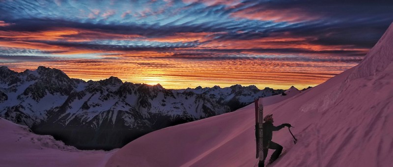 After a quick and hearty breakfast of steaming oats and rich espresso, we set off for the airport, excitement bubbling within us. As the heli climbed it offering a breathtaking view over the stunning icefalls of Fox Glacier, shimmering in the morning light. Our eyes were glued to the window as the majestic Mt. Tasman came into view, its towering mass capturing our attention as we craned our necks to admire its splendor. Upon reaching the hut, we quickly claimed our bunks, stashing our gear in preparation for the adventures ahead. The bright sunshine and crisp mountain air invigorated us as we set out toward the Minarets, eager to seize the beautiful weather and reacquaint ourselves with skiing after a week away from the slopes. However, I have to admit, on that first day, I struggled. A string of restless nights spent in noisy and crowded mountaineering huts had left me feeling drained and dehydrated. During the climb, I paused and drank of half a litre of water, nearly gulping it down, and gradually started to feel more alive. Yet, fate had other plans for us. The snow gods conspired against our ambitions, as easterly winds sculpted tricky wind slabs on the headwall, ultimately forcing us to abandon our ascent. Disappointment washed over me to fail on such a moderate route. On the second day, I set my sights on skiing a small, steep spine, hoping it would help sharpen my focus for the challenges awaiting me. But the cold air had hardened the snow into an unforgiving surface, and once again, I found myself turning around before summiting. It was disheartening to squander two days of promising weather that could have allowed us to tackle much bigger objectives east of the divide. Even more frustrating was the realization that the challenging snow conditions were draining my confidence, leaving me uneasy about the task of conquering the Dragon’s Back on Elie the next day. As Day 3 dawned, it brought with it the promise of warmer temperatures, brilliant sunshine, and gentle breezes. With no alternative plans, we resolved to give it a shot.Our successful streak on Darwin, Dixon, Silberhorn, and Syme had reached its end with failures on Cook (Jone’s Route) and the Minarets, the question was what would fate have in store of us now?.