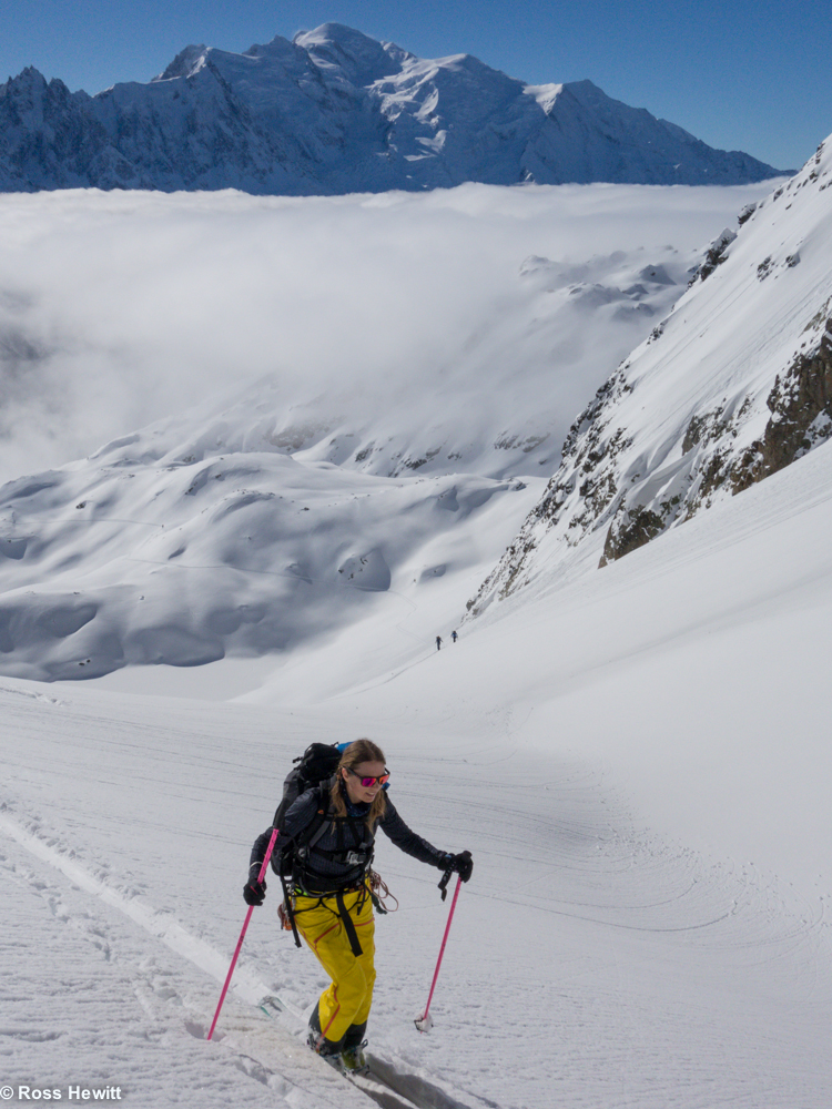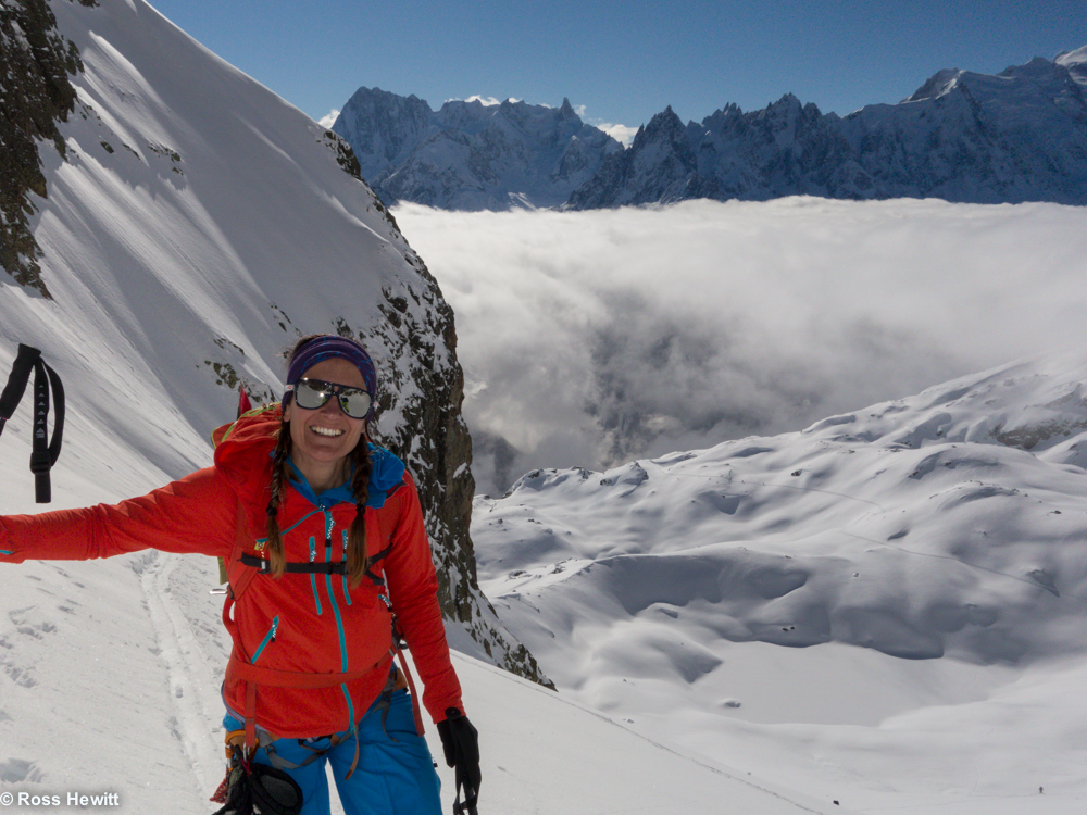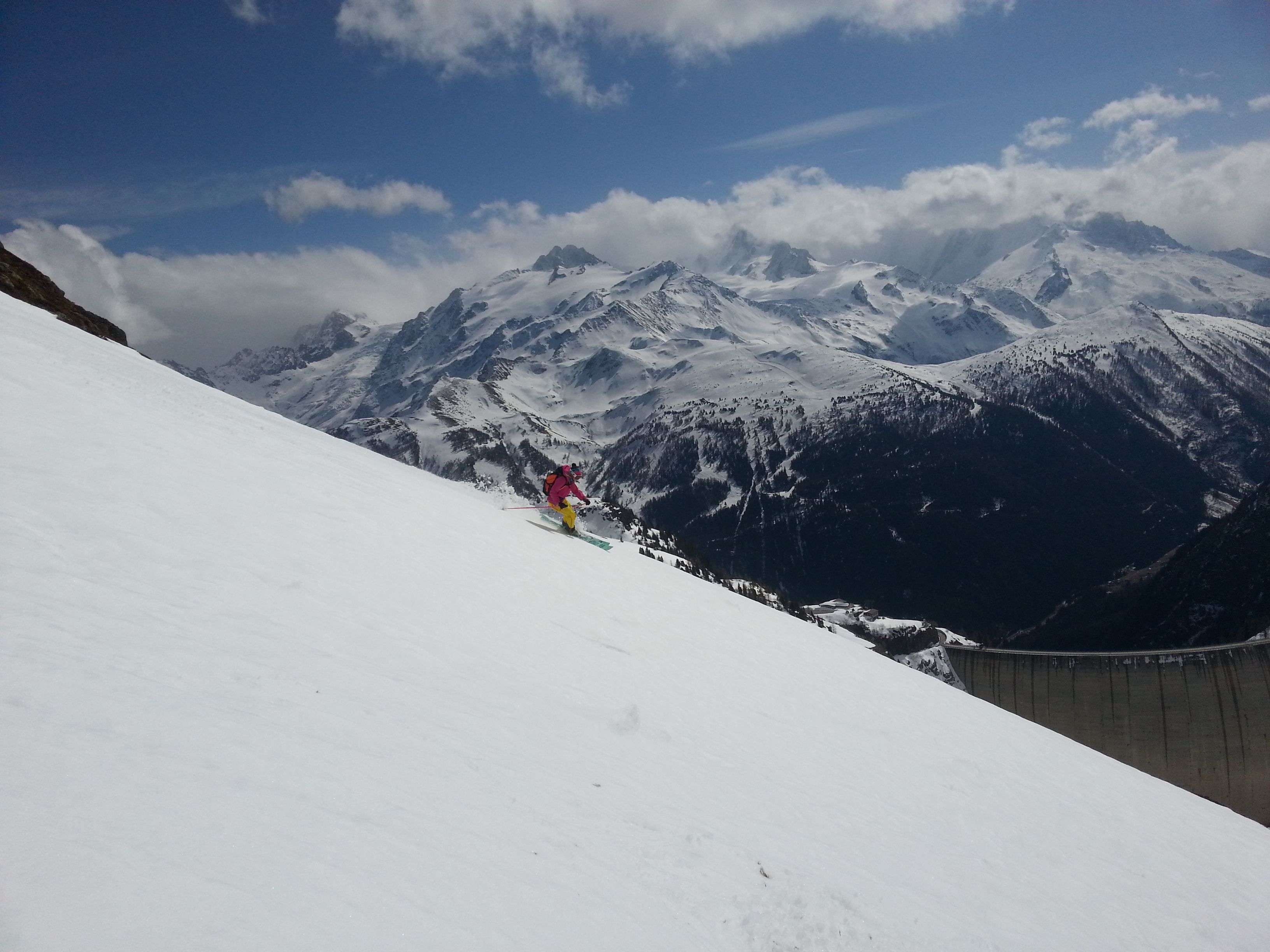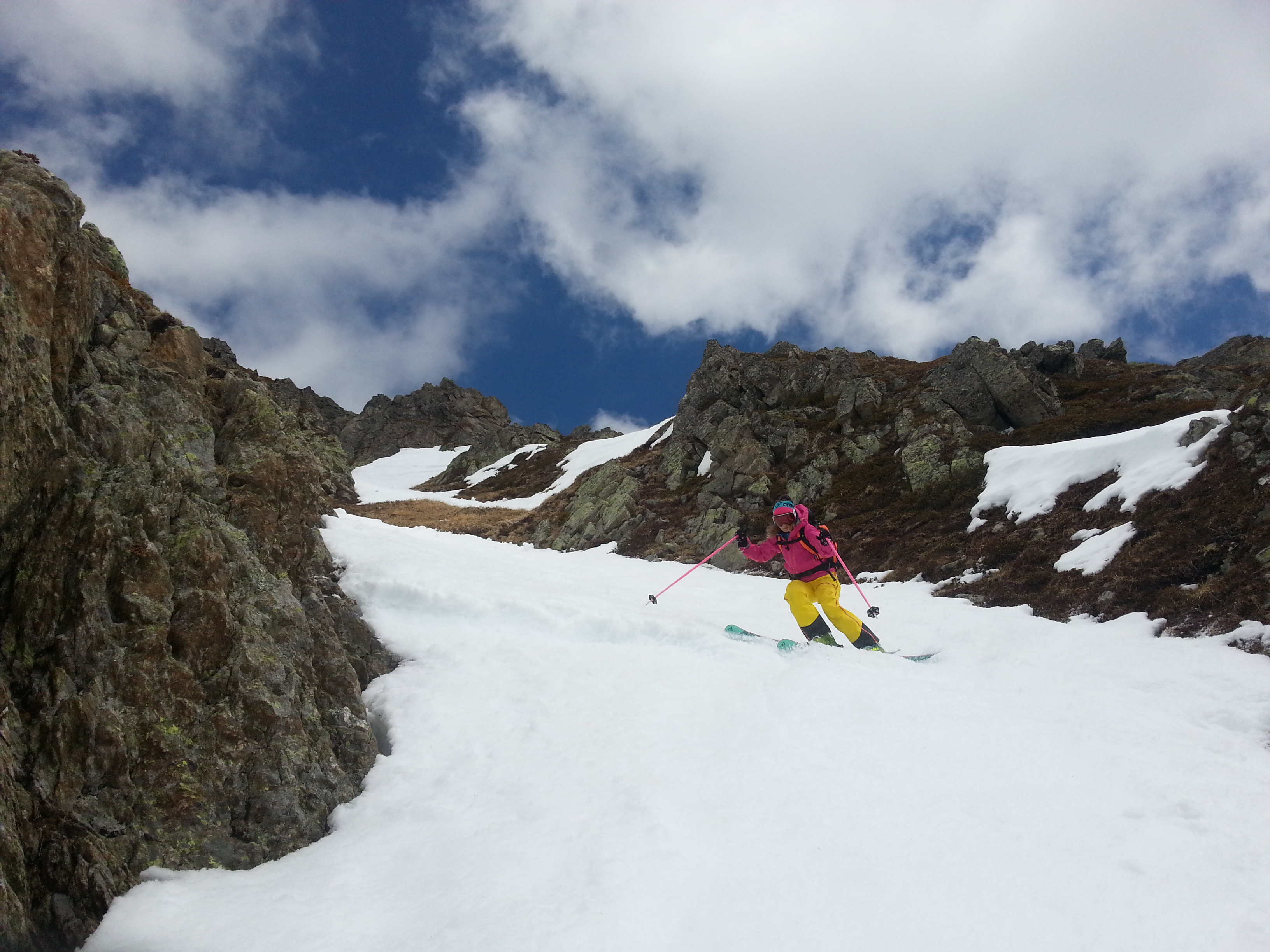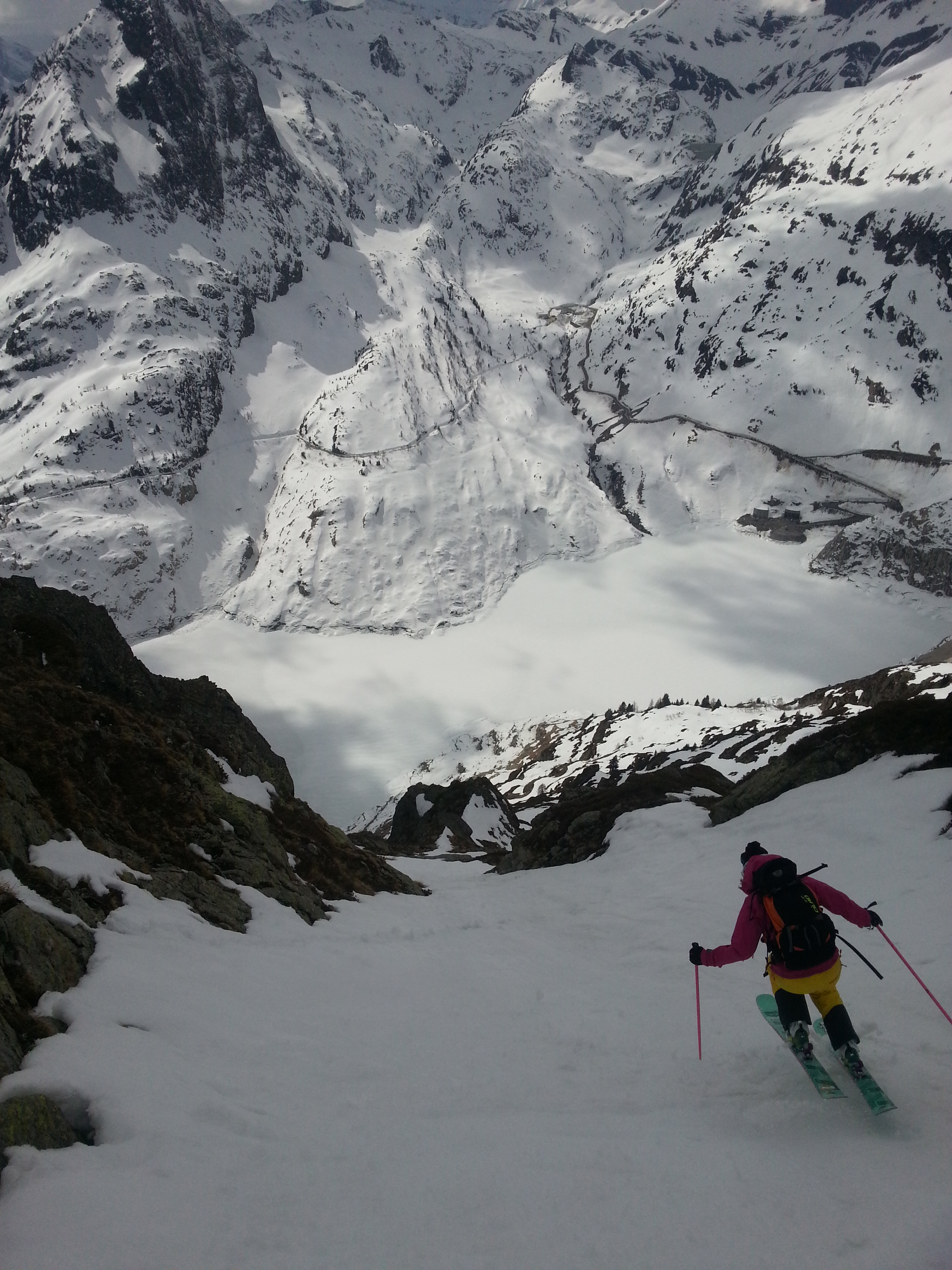 Corn harvesting on Bel Oiseau south west couloir from the summit to the dam with Minna Riihimaki and Tommasco Cardelli. The day got weird near the end.