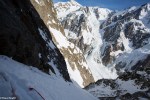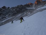 Once again, we stepped out of the hut into a darkness so profound it felt as if we were venturing into the depths of space. I began breaking trail, my eyes fixed on a shimmering star above Lendenfeld, guiding us through the abyss. We soon reached the crevasse field, where Gee took over navigating us skillfully over the icy Bergshrund before we transitioned to crampons. The frigid wind relentlessly clawed at our hands and feet, urging us to move swiftly up the apron to generate warmth. As we climbed higher, the howling wind intensified, stripping away any remaining heat. Exiting the protective confines of the couloir, we were confronted by the full force of the icy blast. I paused for a moment, fumbling to put on my heavy down jacket and mitts, feeling their comforting insulation against the biting cold.