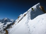 Now the sun peered over the horizon and we turned to greet it in worship, welcoming its warming rays, as once again the mountain was painted pink in the avant glow of dawn. After bring confined to the space limited by our head torches’ illumination, the stunning landscape unfurled before us, revealing the vast expanse below. The wind blasted snow across the ridge, the Grand Plateau far below, and beyond mountainous islands floating in a sea of clouds, whilst the horizon was ablaze as the sun climbed ever higher. We continued up, filled with the otherworldly feelings of being on a Himalayan Giant.