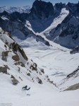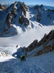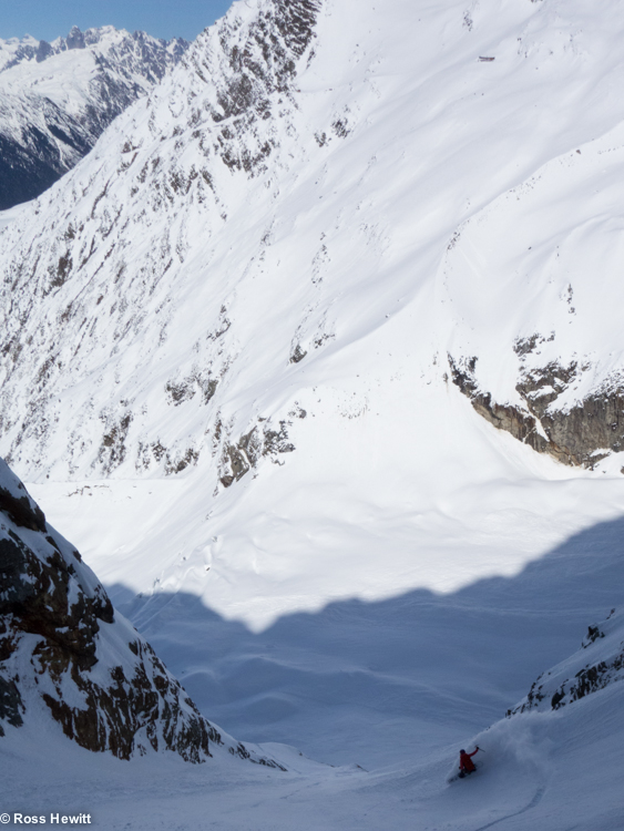 A thrilling pulse of excitement coursed down my spine, igniting every nerve in my body. After years of anticipation, I was finally on the verge of fulfilling a long-held dream: riding Syme. With each sweeping turn, we glided down the initial slopes of wind-pressed powder in between patches of glistening ice. Gee, deftly zagged around the ice cave pitch, to get to the top of the diamond face. He then chose a conservative line, launching down the right spine in a series of hop turns while leaving the diamond for Christina and me to carve some freeride lines.